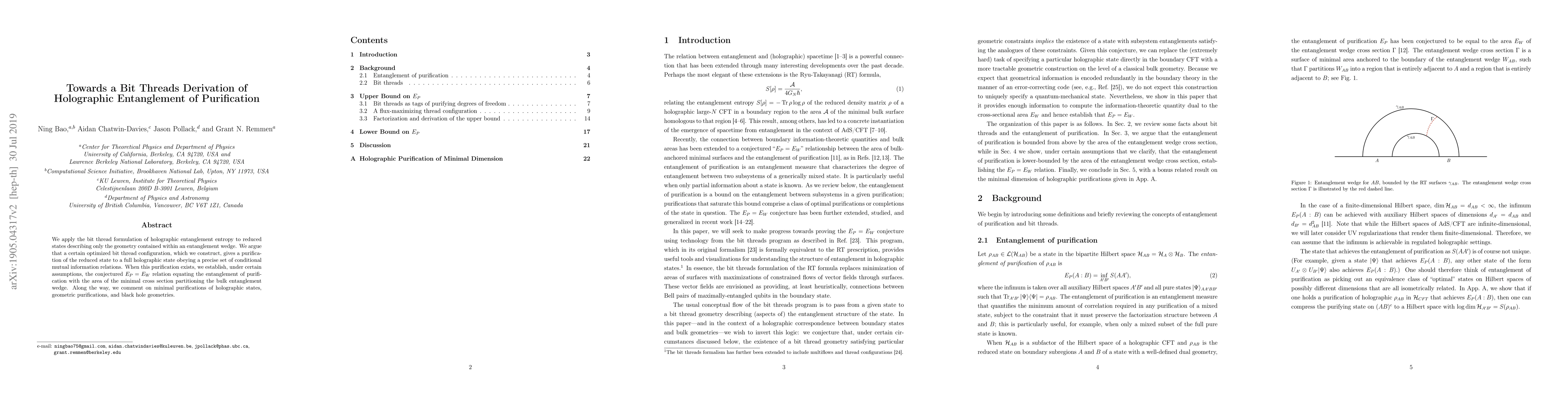 We apply the bit thread formulation of holographic entanglement entropy to reduced states describing only the geometry contained within an entanglement wedge. We argue that a certain optimized bit thread configuration, which we construct, gives a purification of the reduced state to a full holographic state obeying a precise set of conditional mutual information relations. When this purification exists, we establish, under certain assumptions, the conjectured $E_P = E_W$ relation equating the entanglement of purification with the area of the minimal cross section partitioning the bulk entanglement wedge. Along the way, we comment on minimal purifications of holographic states, geometric purifications, and black hole geometries.