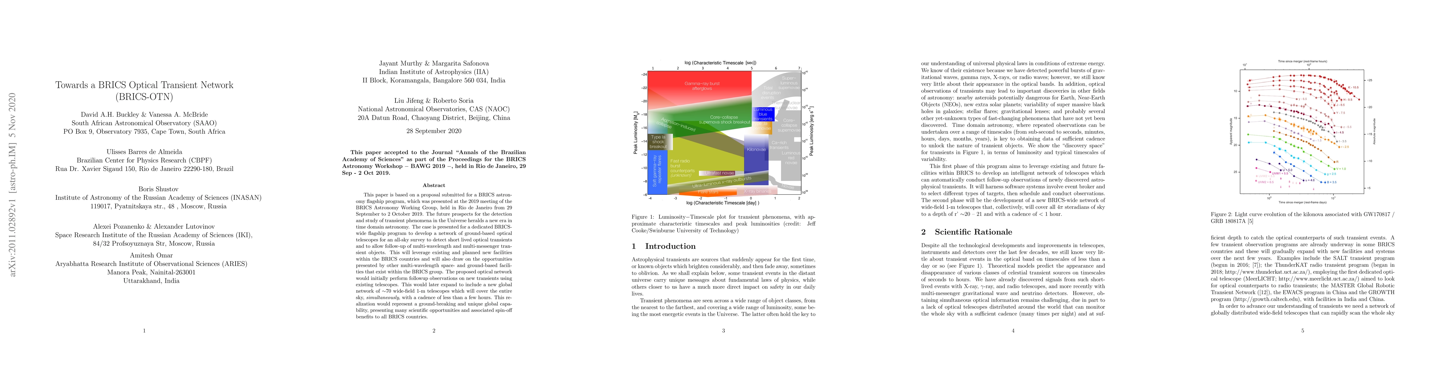 This paper is based on a proposal submitted for a BRICS astronomy flagship program, which was presented at the 2019 meeting of the BRICS Astronomy Working Group, held in Rio de Janeiro from 29 September to 2 October 2019. The future prospects for the detection and study of transient phenomena in the Universe heralds a new era in time domain astronomy. The case is presented for a dedicated BRICS-wide flagship program to develop a network of ground-based optical telescopes for an all-sky survey to detect short lived optical transients and to allow follow-up of multi-wavelength and multi-messenger transient objects. This will leverage existing and planned new facilities within the BRICS countries and will also draw on the opportunities presented by other multi-wavelength space- and ground-based facilities that exist within the BRICS group. The proposed optical network would initially perform followup observations on new transients using existing telescopes. This would later expand to include a new global network of $\sim$70 wide-field 1-m telescopes which will cover the entire sky, simultaneously, with a cadence of less than a few hours. This realization would represent a ground-breaking and unique global capability, presenting many scientific opportunities and associated spin-off benefits to all BRICS countries.