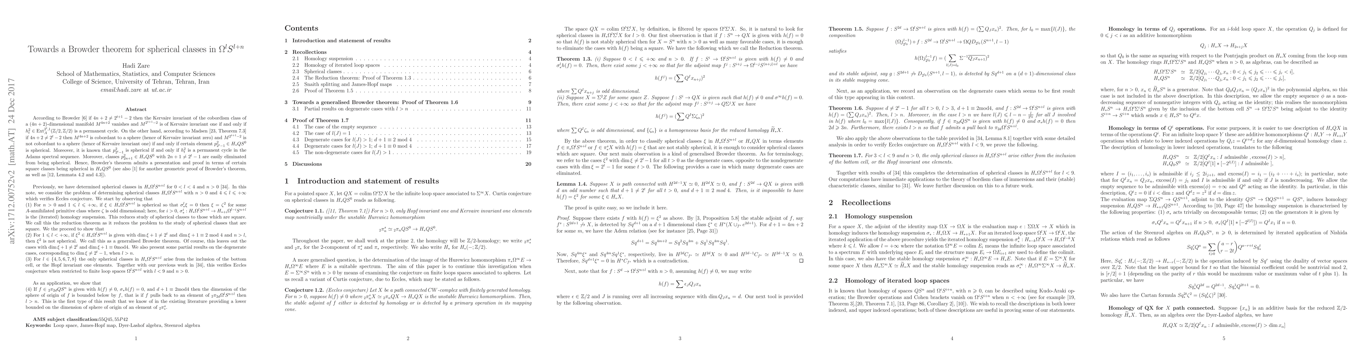 According to Browder if $4n+2\neq 2^{t+1}-2$ then the Kervaire invariant of the cobordism class of a $(4n+2)$-dimensional manifold $M^{4n+2}$ vanishes and $M^{2^{t+1}-2}$ is of Kervaire invariant one if and only if $h_t^2\in\mathrm{Ext}(\mathbb{Z}/2,\mathbb{Z}/2)$ is a permanent cycle. On the other hand, according to Madsen if $4n+2\neq 2^t-2$ then $M^{4n+2}$ is cobordant to a sphere (hence of Kervaire invariant zero) and $M^{2^{t+1}-2}$ is not cobordant to a sphere (hence of Kervaire invariant one) if and only if certain element $p_{2^{t}-1}^2\in H_*QS^0$ is spherical. Moreover, it is known that $p_{2^t-1}^2$ is spherical if and only if $h_t^2$ is a permanent cycle in the Adams spectral sequence. Moreover, classes $p_{2n+1}^2\in H_*QS^0$ with $2n+1\neq 2^t-1$ are easily eliminated from being spherical. Hence, Browder's theorem admits a presentation and proof in terms of certain square classes being spherical in $H_*QS^0$ (see also work of Akhmetev and Eccles). In this note, we consider the problem of determining spherical classes $H_*\Omega^lS^{n+l}$ with $n>0$ and $4\leqslant l\leqslant +\infty$. We show (1) if $\xi^2\in H_*\Omega^lS^{n+l}$ is given with $\dim\xi+1\neq 2^t$ and $\dim \xi+1\equiv 2\textrm{ mod }4$ and $n>l$, then $\xi^2$ is not spherical. We refer to this as a generalised Browder theorem. We also present some partial results on the degenerate cases, corresponding to $\dim\xi\neq 2^t-1$, when $l>n$. (2) For $l\in\{4,5,6,7,8\}$ the only spherical classes in $H_*\Omega^lS^{n+l}$ arise from the inclusion of the bottom cell, or the Hopf invariant one elements. This verifies Eccles conjecture when restricted to finite loop spaces with $l<9$.