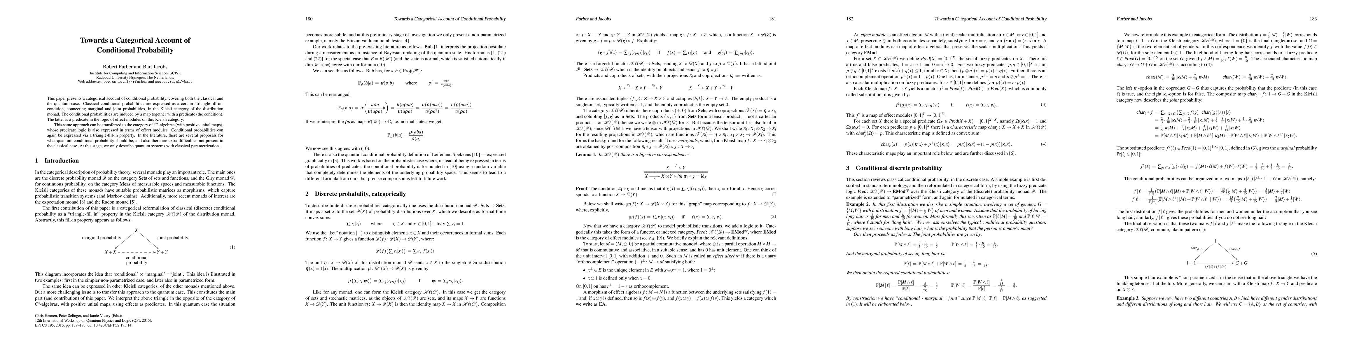 This paper develops a categorical framework for conditional probability, applying it to both classical and quantum systems. It uses the Kleisli category of the distribution monad to describe classical conditional probabilities and extends the approach to quantum systems via the category of C*-algebras.
