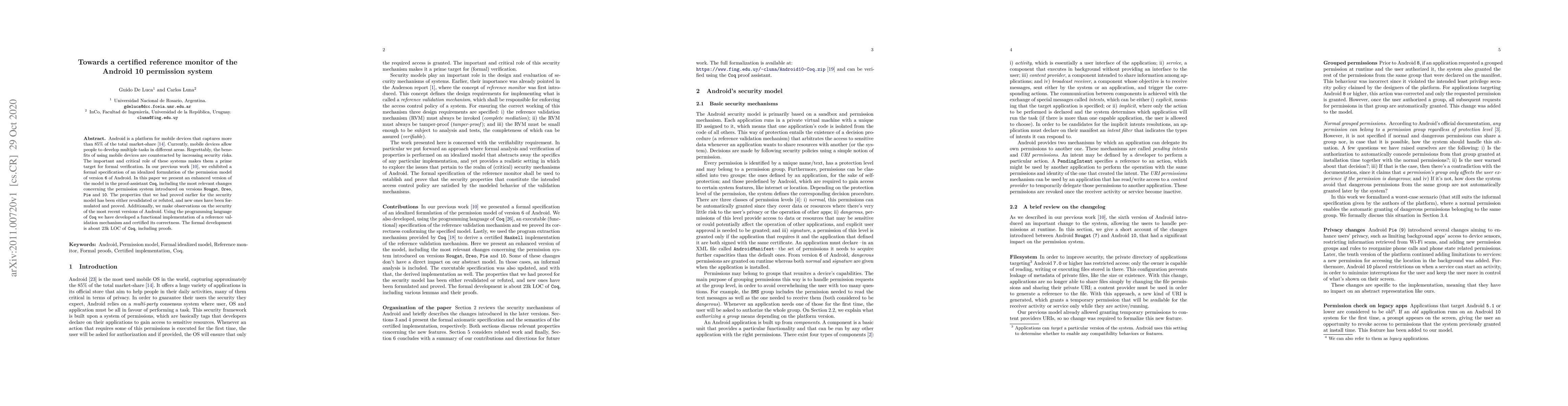 This paper presents an enhanced formal specification of the Android 10 permission system in Coq, incorporating updates from Nougat, Oreo, Pie, and 10. It validates and refutes previous security properties, formulates new ones, and certifies a reference validation mechanism's correctness using a 23k LOC Coq formal development.