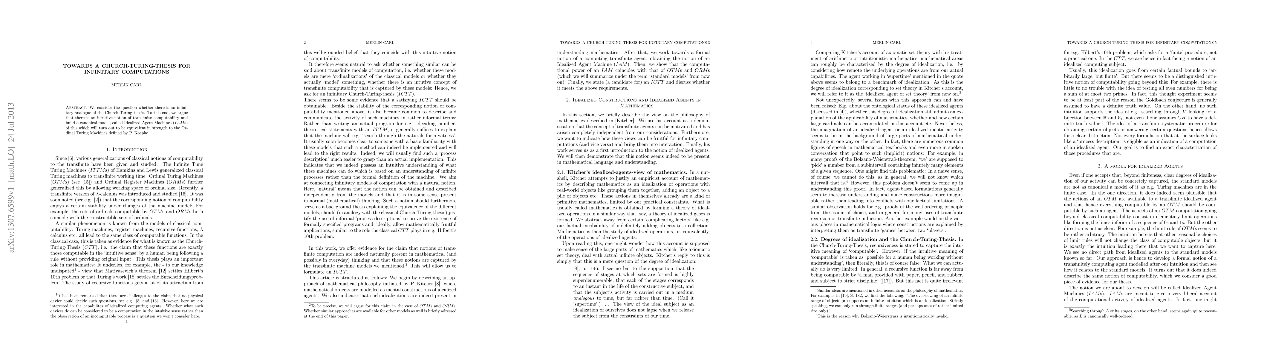 This paper explores the possibility of an infinitary analogue of the Church-Turing thesis by introducing a concept of transfinite computability and constructing Idealized Agent Machines ($IAM$s), which are shown to be equivalent in computational power to Ordinal Turing Machines.