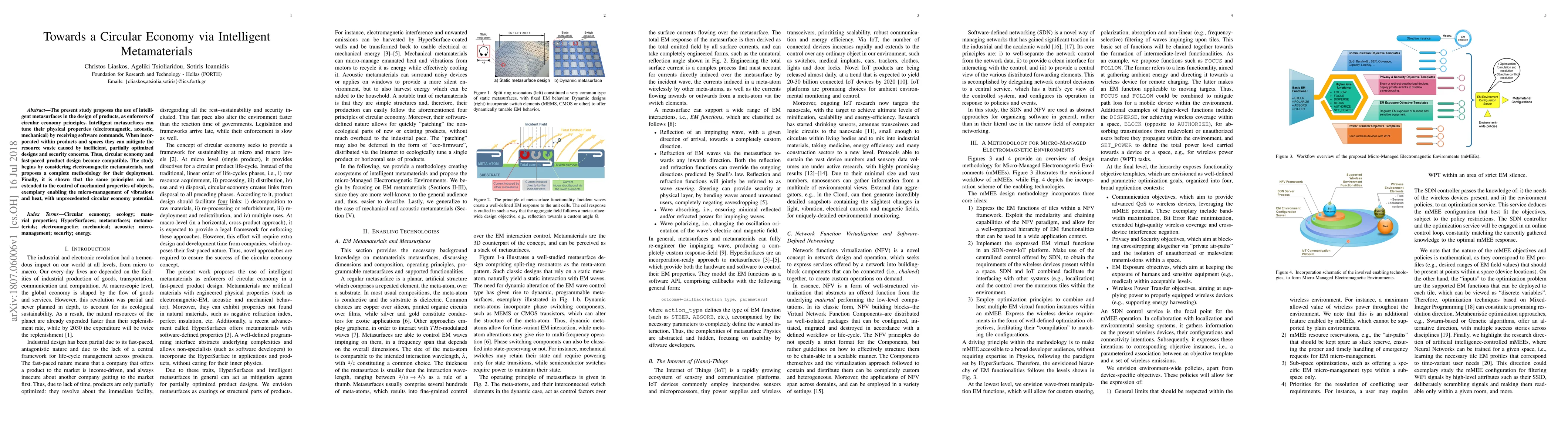This paper explores the use of intelligent metasurfaces to enforce circular economy principles by enabling products to dynamically adjust their physical properties, thus reducing resource waste and enhancing design efficiency. The study outlines a comprehensive methodology for deploying electromagnetic metamaterials and extends these principles to control mechanical properties, offering significant potential for sustainable product design.