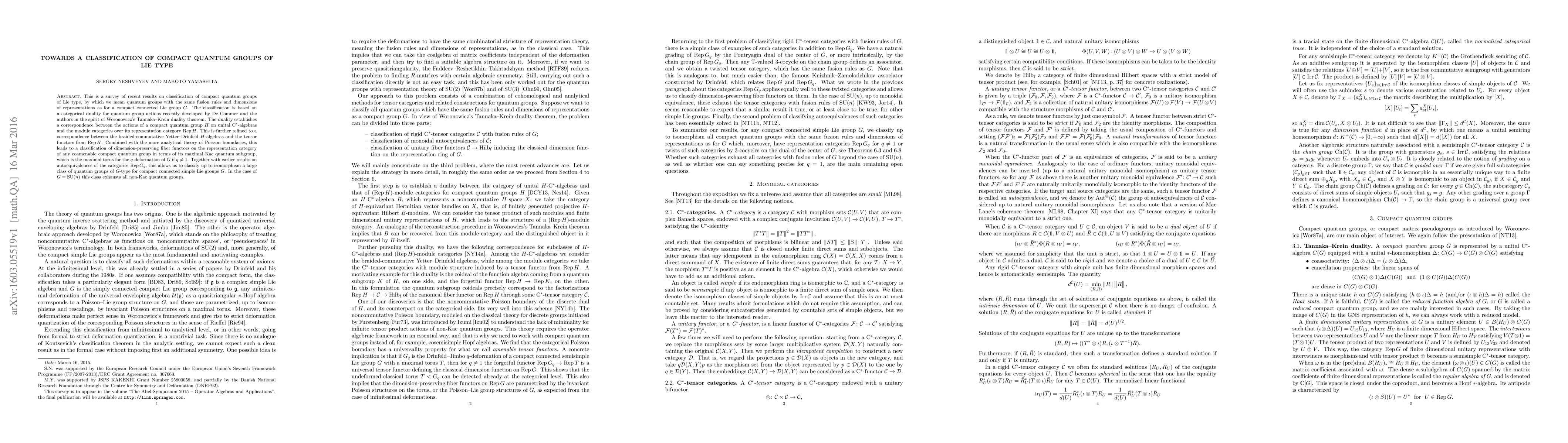 This is a survey of recent results on classification of compact quantum groups of Lie type, by which we mean quantum groups with the same fusion rules and dimensions of representations as for a compact connected Lie group $G$. The classification is based on a categorical duality for quantum group actions recently developed by De Commer and the authors in the spirit of Woronowicz's Tannaka--Krein duality theorem. The duality establishes a correspondence between the actions of a compact quantum group $H$ on unital C$^*$-algebras and the module categories over its representation category Rep $H$. This is further refined to a correspondence between the braided-commutative Yetter--Drinfeld $H$-algebras and the tensor functors from Rep $H$. Combined with the more analytical theory of Poisson boundaries, this leads to a classification of dimension-preserving fiber functors on the representation category of any coamenable compact quantum group in terms of its maximal Kac quantum subgroup, which is the maximal torus for the $q$-deformation of $G$ if $q\ne1$. Together with earlier results on autoequivalences of the categories Rep $G_q$, this allows us to classify up to isomorphism a large class of quantum groups of $G$-type for compact connected simple Lie groups $G$. In the case of $G=SU(n)$ this class exhausts all non-Kac quantum groups.