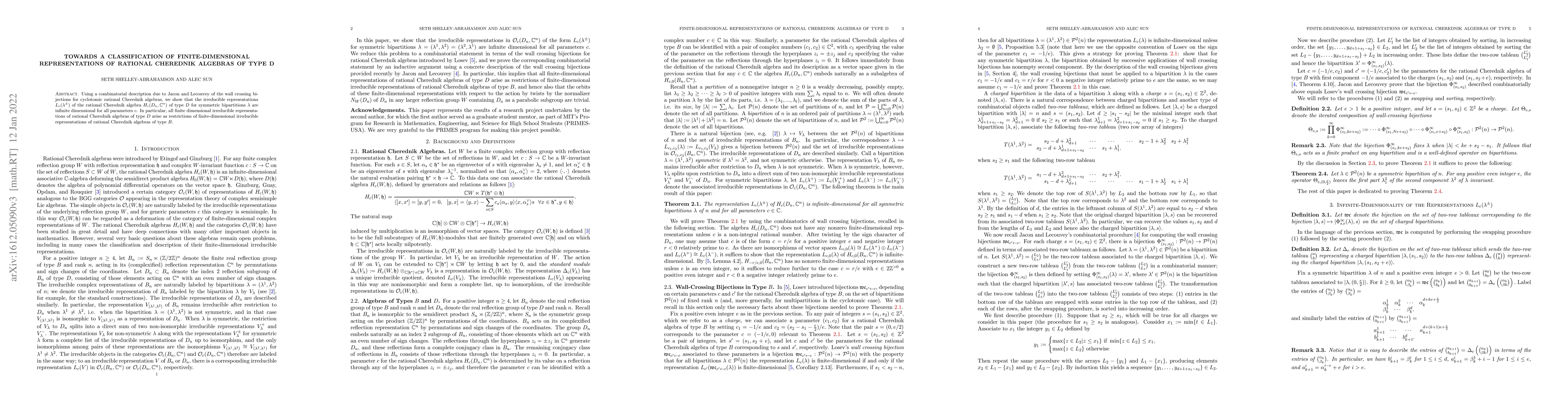 Using a combinatorial description due to Jacon and Lecouvey of the wall crossing bijections for cyclotomic rational Cherednik algebras, we show that the irreducible representations $L_c(\lambda^\pm)$ of the rational Cherednik algebra $H_c(D_n, \mathbb{C}^n)$ of type $D$ for symmetric bipartitions $\lambda$ are infinite dimensional for all parameters $c$. In particular, all finite-dimensional irreducible representations of rational Cherednik algebras of type $D$ arise as restrictions of finite-dimensional irreducible representations of rational Cherednik algebras of type $B$.