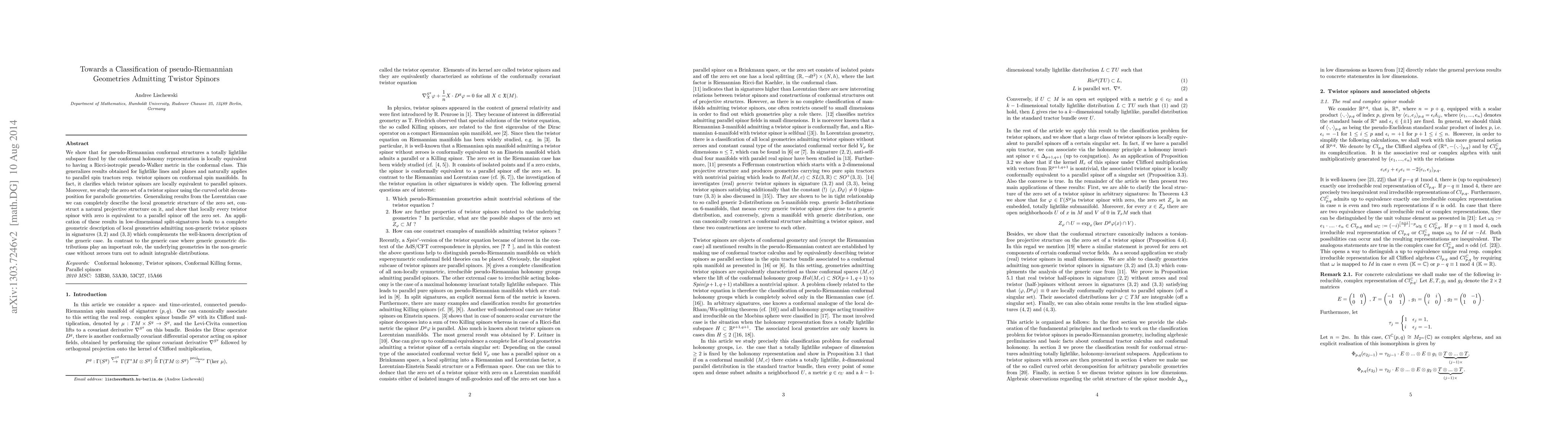 This paper classifies pseudo-Riemannian geometries that support twistor spinors by demonstrating the existence of a local metric that is Ricci-isotropic and supports a parallel, lightlike distribution. It also explores the local structure of the zero set of twistor spinors and provides a complete geometric description for low-dimensional split-signatures, particularly in (3,2) and (3,3) signatures.