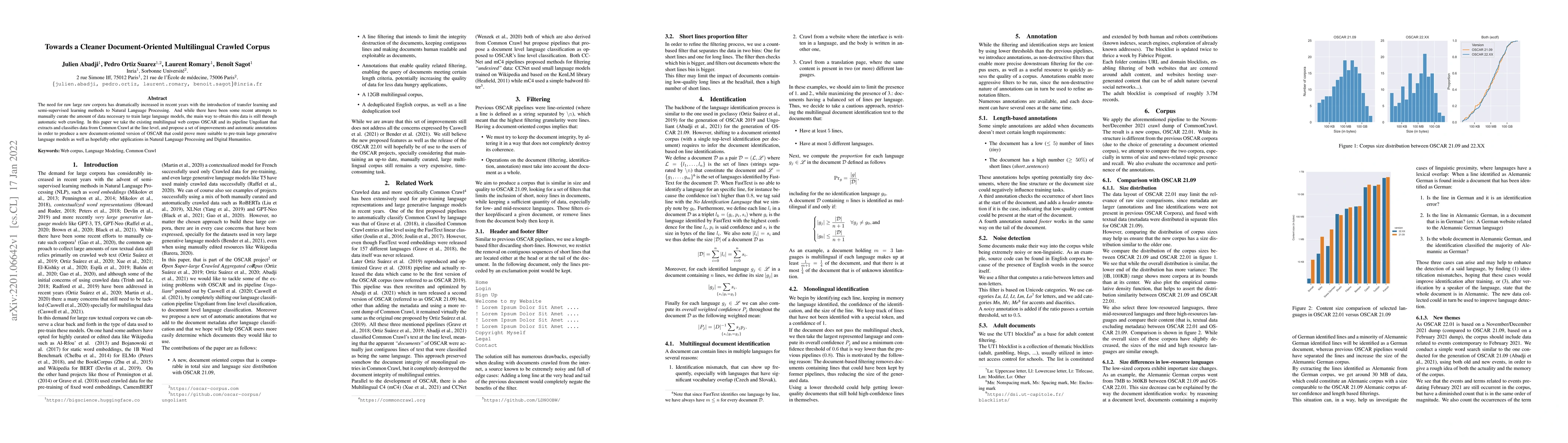 The need for raw large raw corpora has dramatically increased in recent years with the introduction of transfer learning and semi-supervised learning methods to Natural Language Processing. And while there have been some recent attempts to manually curate the amount of data necessary to train large language models, the main way to obtain this data is still through automatic web crawling. In this paper we take the existing multilingual web corpus OSCAR and its pipeline Ungoliant that extracts and classifies data from Common Crawl at the line level, and propose a set of improvements and automatic annotations in order to produce a new document-oriented version of OSCAR that could prove more suitable to pre-train large generative language models as well as hopefully other applications in Natural Language Processing and Digital Humanities.