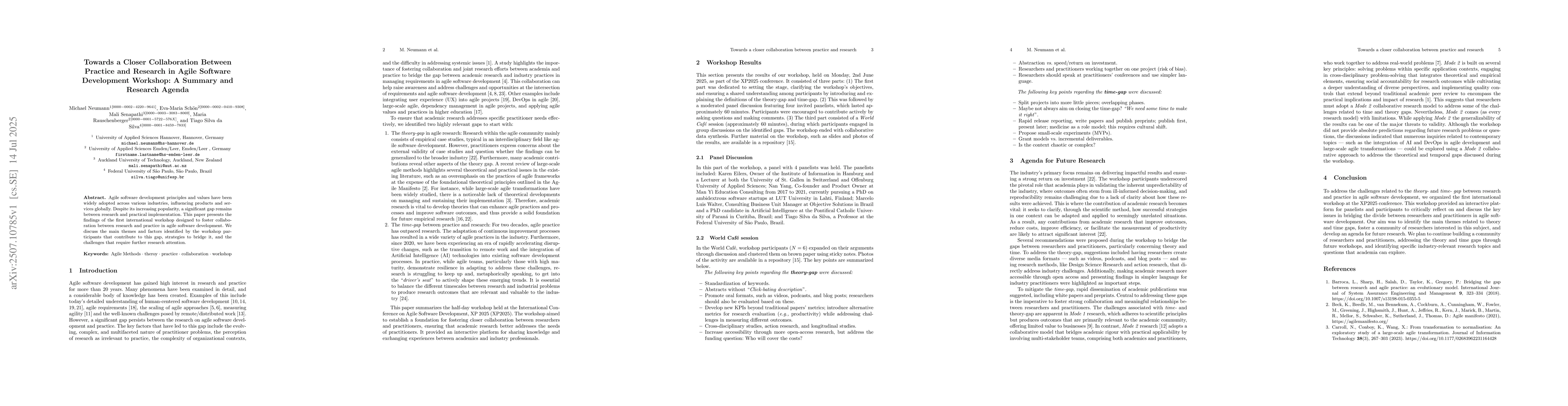 Agile software development principles and values have been widely adopted across various industries, influencing products and services globally. Despite its increasing popularity, a significant gap remains between research and practical implementation. This paper presents the findings of the first international workshop designed to foster collaboration between research and practice in agile software development. We discuss the main themes and factors identified by the workshop participants that contribute to this gap, strategies to bridge it, and the challenges that require further research attention.