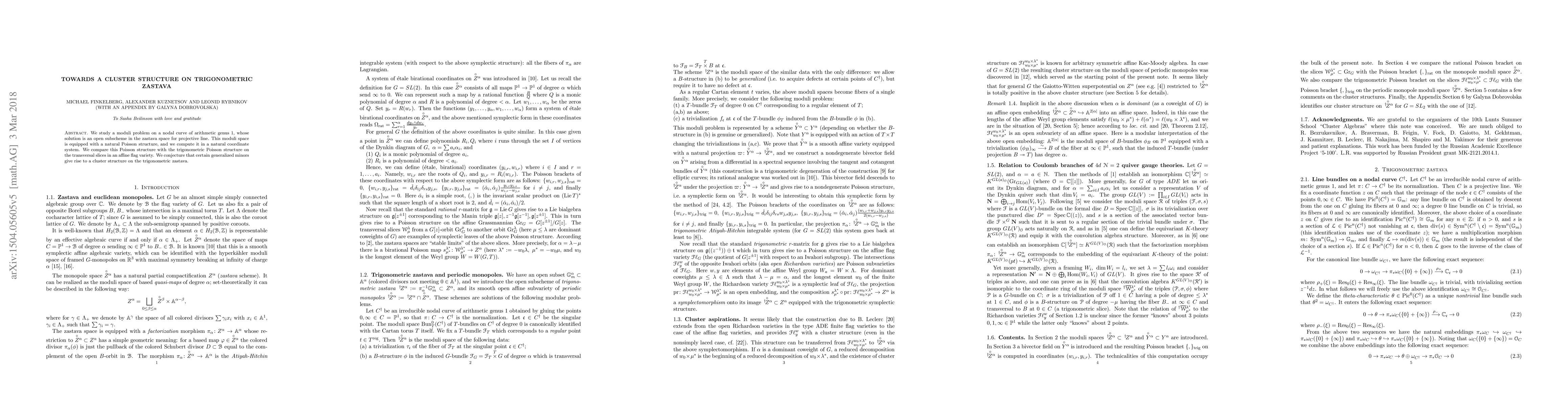 This paper investigates a moduli problem on a nodal curve of genus 1, leading to an open subscheme in the zastava space for the projective line. It computes the natural Poisson structure in a coordinate system and conjectures that generalized minors induce a cluster structure on the trigonometric zastava.