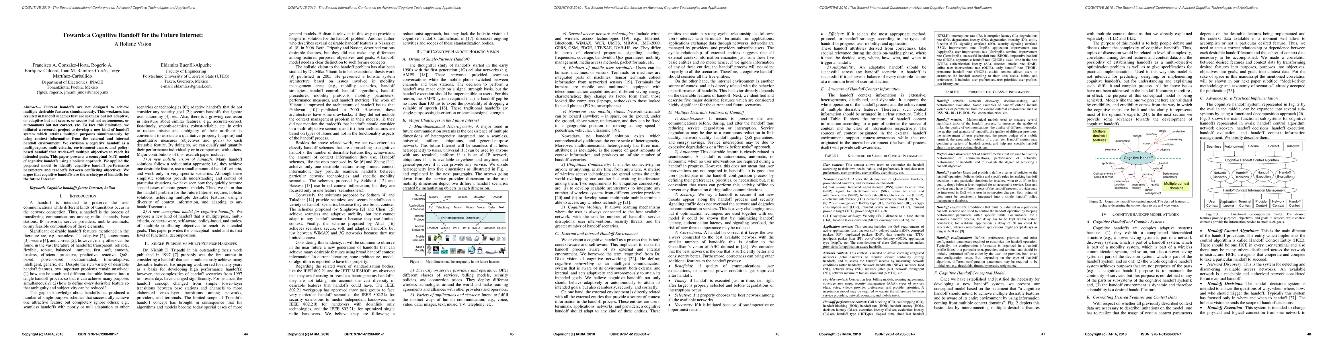 Current handoffs are not designed to achieve multiple desirable features simultaneously. This weakness has resulted in handoff schemes that are seamless but not adaptive, or adaptive but not secure, or secure but not autonomous, or autonomous but not correct, etc. To face this limitation, we initiated a research project to develop a new kind of handoff system which attains multiple purposes simultaneously by using context information from the external and internal handoff environment. We envision a cognitive handoff as a multipurpose, multi-criteria, environment-aware, and policy-based handoff that trades-off multiple objectives to reach its intended goals. This paper presents a conceptual (soft) model of cognitive handoffs using a holistic approach. We applied the proposed model to identify cognitive handoff performance parameters and tradeoffs between conflicting objectives. We argue that cognitive handoffs are the archetype of handoffs for the future Internet.
