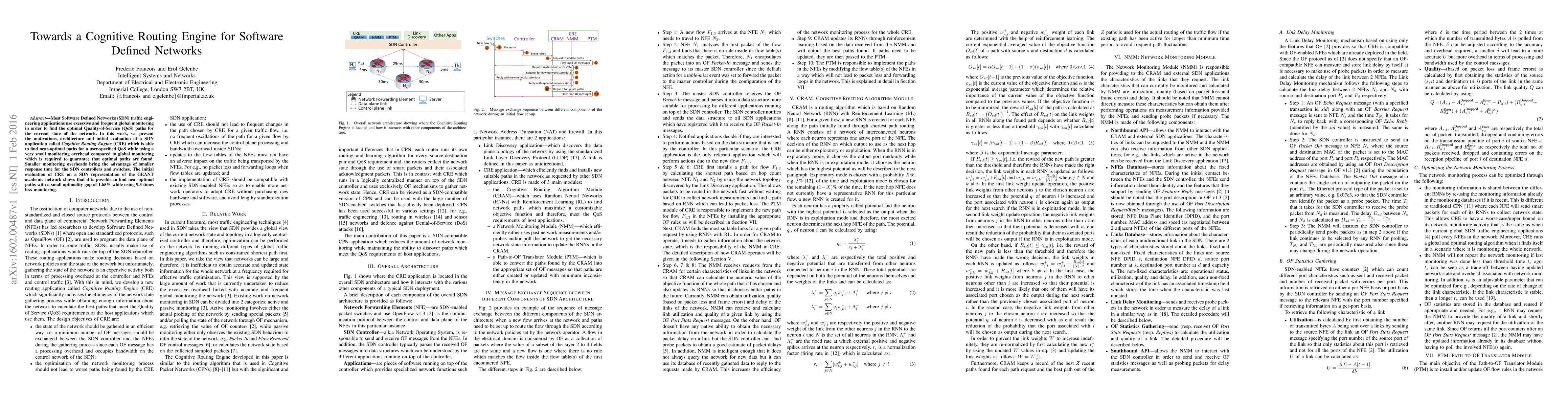 This paper introduces the Cognitive Routing Engine (CRE), an SDN application designed to find near-optimal Quality-of-Service paths with minimal monitoring overhead, significantly reducing response times for SDN controllers and switches. Initial evaluation on the GEANT network demonstrates a 1.65% optimality gap while using 9.5 times less monitoring than global methods.