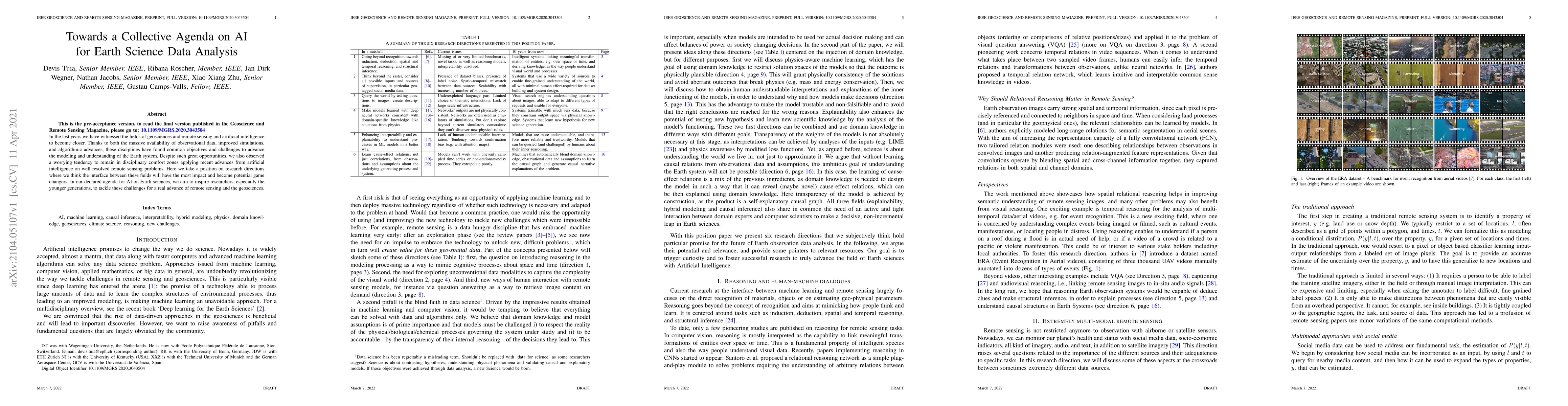 In the last years we have witnessed the fields of geosciences and remote sensing and artificial intelligence to become closer. Thanks to both the massive availability of observational data, improved simulations, and algorithmic advances, these disciplines have found common objectives and challenges to advance the modeling and understanding of the Earth system. Despite such great opportunities, we also observed a worrying tendency to remain in disciplinary comfort zones applying recent advances from artificial intelligence on well resolved remote sensing problems. Here we take a position on research directions where we think the interface between these fields will have the most impact and become potential game changers. In our declared agenda for AI on Earth sciences, we aim to inspire researchers, especially the younger generations, to tackle these challenges for a real advance of remote sensing and the geosciences.