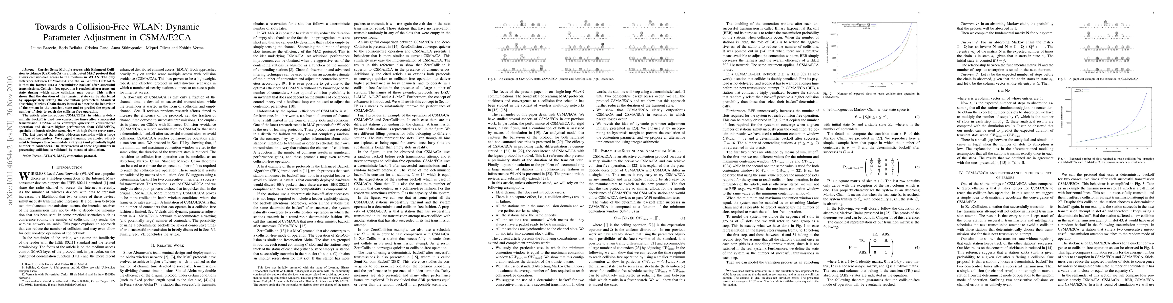 Carrier Sense Multiple Access with Enhanced Collision Avoidance (CSMA/ECA) is a distributed MAC protocol that allows collision-free access to the medium in WLAN. The only difference between CSMA/ECA and the well-known CSMA/CA is that the former uses a deterministic backoff after successful transmissions. Collision-free operation is reached after a transient state during which some collisions may occur. This article shows that the duration of the transient state can be shortened by appropriately setting the contention parameters. Standard absorbing Markov Chain theory can be used to describe the behaviour of the system in the transient state and to predict the expected number of slots to reach the collision-free operation. The article also introduces CSMA/E2CA, in which a deterministic backoff is used two consecutive times after a successful transmission. CSMA/E2CA converges quicker to collision-free operation and delivers higher performance than CSMA/CA in harsh wireless scenarios with high frame error rates. To achieve collision-free operations when the number of contenders is large, it may be necessary to dynamically adjust the contention parameter. The last part of the article suggests an approach for such parameter adjustment which is validated by simulation results.
