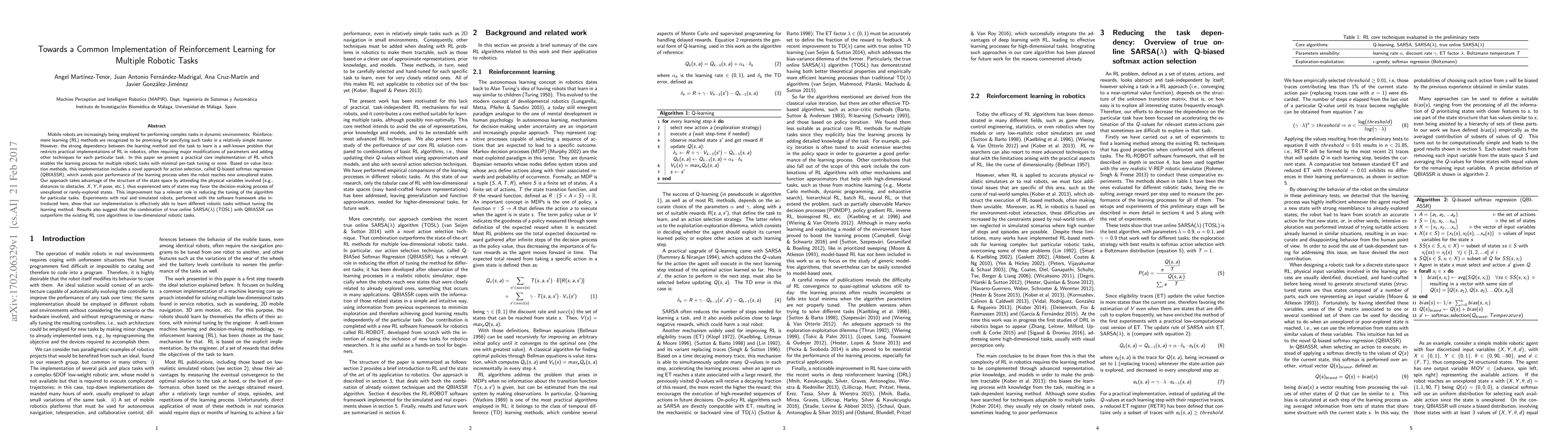 Mobile robots are increasingly being employed for performing complex tasks in dynamic environments. Reinforcement learning (RL) methods are recognized to be promising for specifying such tasks in a relatively simple manner. However, the strong dependency between the learning method and the task to learn is a well-known problem that restricts practical implementations of RL in robotics, often requiring major modifications of parameters and adding other techniques for each particular task. In this paper we present a practical core implementation of RL which enables the learning process for multiple robotic tasks with minimal per-task tuning or none. Based on value iteration methods, this implementation includes a novel approach for action selection, called Q-biased softmax regression (QBIASSR), which avoids poor performance of the learning process when the robot reaches new unexplored states. Our approach takes advantage of the structure of the state space by attending the physical variables involved (e.g., distances to obstacles, X,Y,{\theta} pose, etc.), thus experienced sets of states may favor the decision-making process of unexplored or rarely-explored states. This improvement has a relevant role in reducing the tuning of the algorithm for particular tasks. Experiments with real and simulated robots, performed with the software framework also introduced here, show that our implementation is effectively able to learn different robotic tasks without tuning the learning method. Results also suggest that the combination of true online SARSA({\lambda}) with QBIASSR can outperform the existing RL core algorithms in low-dimensional robotic tasks.