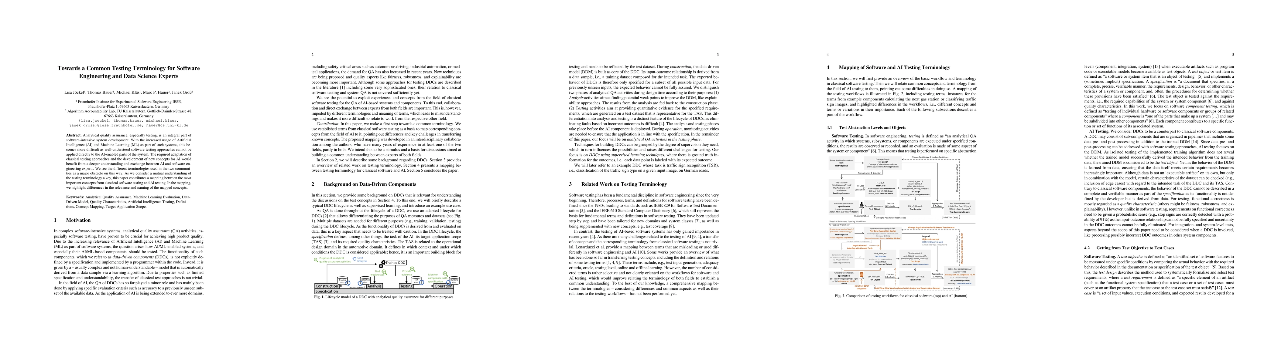 Analytical quality assurance, especially testing, is an integral part of software-intensive system development. With the increased usage of Artificial Intelligence (AI) and Machine Learning (ML) as part of such systems, this becomes more difficult as well-understood software testing approaches cannot be applied directly to the AI-enabled parts of the system. The required adaptation of classical testing approaches and the development of new concepts for AI would benefit from a deeper understanding and exchange between AI and software engineering experts. We see the different terminologies used in the two communities as a major obstacle on this way. As we consider a mutual understanding of the testing terminology a key, this paper contributes a mapping between the most important concepts from classical software testing and AI testing. In the mapping, we highlight differences in the relevance and naming of the mapped concepts.
