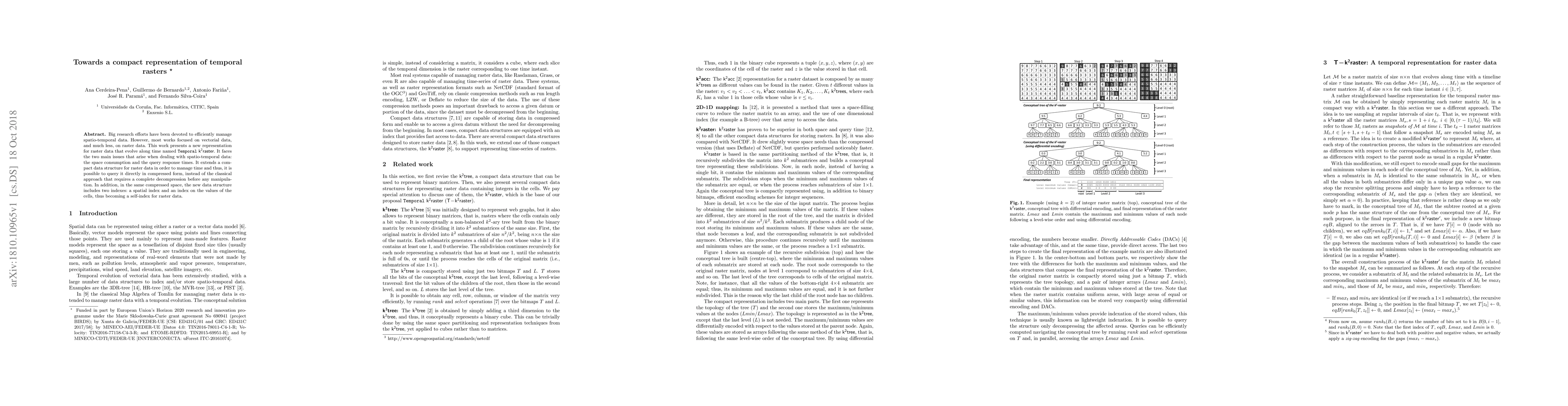 Big research efforts have been devoted to efficiently manage spatio-temporal data. However, most works focused on vectorial data, and much less, on raster data. This work presents a new representation for raster data that evolve along time named Temporal k^2 raster. It faces the two main issues that arise when dealing with spatio-temporal data: the space consumption and the query response times. It extends a compact data structure for raster data in order to manage time and thus, it is possible to query it directly in compressed form, instead of the classical approach that requires a complete decompression before any manipulation. In addition, in the same compressed space, the new data structure includes two indexes: a spatial index and an index on the values of the cells, thus becoming a self-index for raster data.