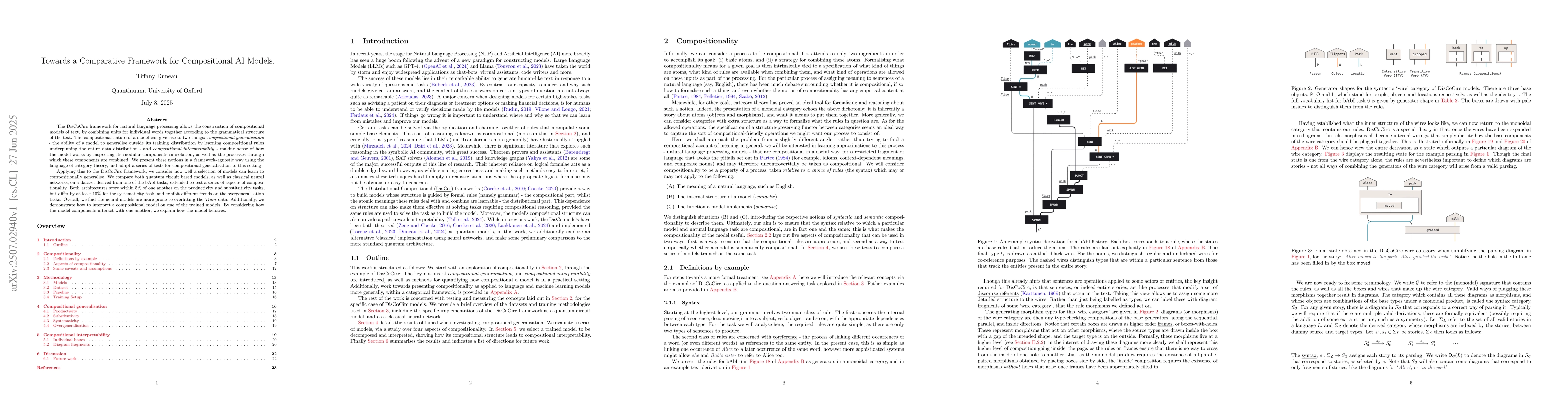 The DisCoCirc framework for natural language processing allows the construction of compositional models of text, by combining units for individual words together according to the grammatical structure of the text. The compositional nature of a model can give rise to two things: compositional generalisation -- the ability of a model to generalise outside its training distribution by learning compositional rules underpinning the entire data distribution -- and compositional interpretability -- making sense of how the model works by inspecting its modular components in isolation, as well as the processes through which these components are combined. We present these notions in a framework-agnostic way using the language of category theory, and adapt a series of tests for compositional generalisation to this setting. Applying this to the DisCoCirc framework, we consider how well a selection of models can learn to compositionally generalise. We compare both quantum circuit based models, as well as classical neural networks, on a dataset derived from one of the bAbI tasks, extended to test a series of aspects of compositionality. Both architectures score within 5% of one another on the productivity and substitutivity tasks, but differ by at least 10% for the systematicity task, and exhibit different trends on the overgeneralisation tasks. Overall, we find the neural models are more prone to overfitting the Train data. Additionally, we demonstrate how to interpret a compositional model on one of the trained models. By considering how the model components interact with one another, we explain how the model behaves.