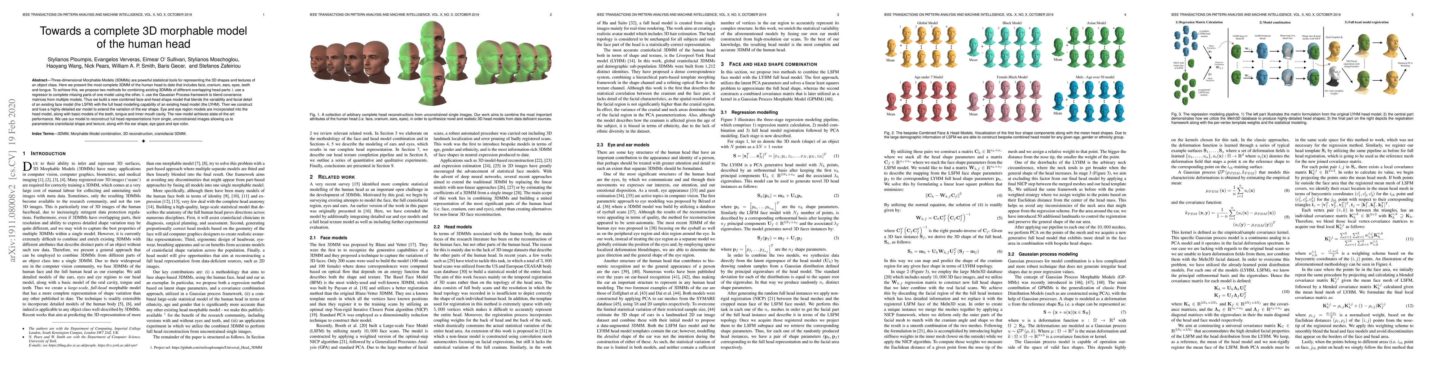 A new 3D morphable model of the human head has been developed, combining existing models to achieve state-of-the-art performance in reconstructing full head representations from single images.