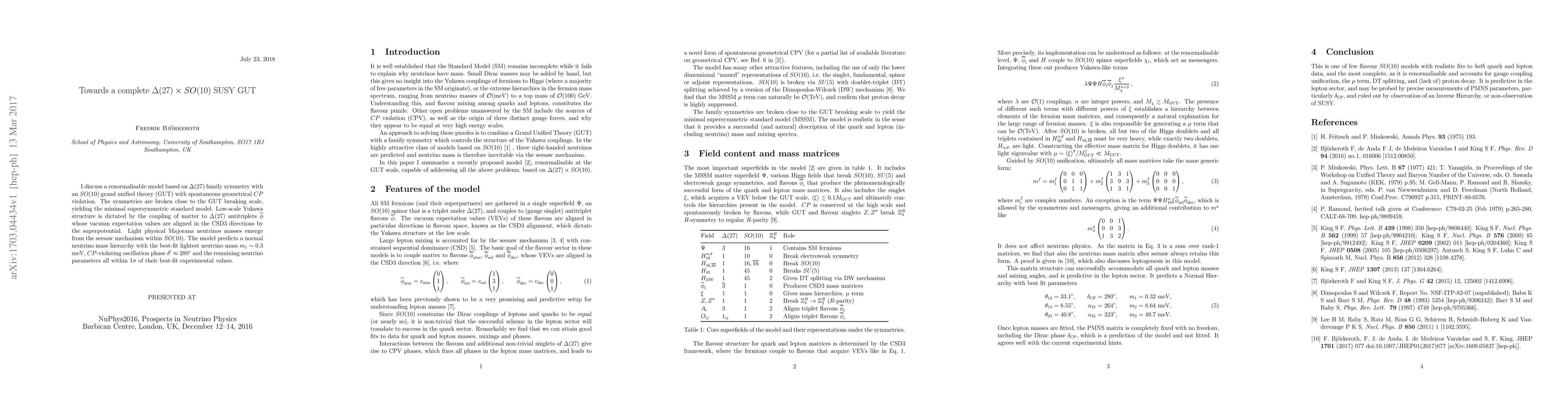 The research uses a renormalisable model based on \Delta(27) family symmetry with an SO(10) grand unified theory (GUT)