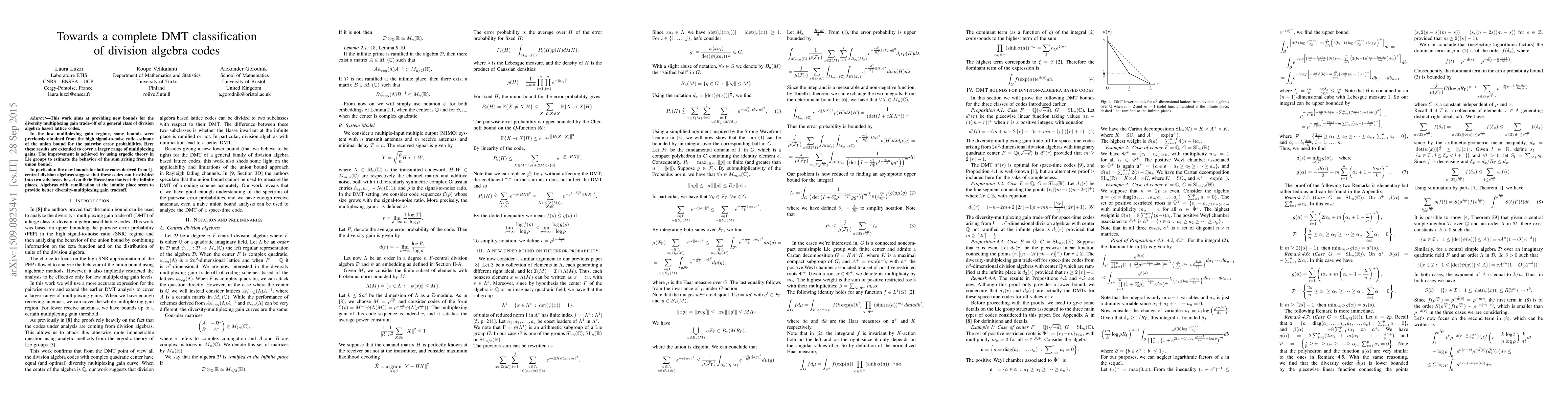This paper extends previous bounds on the diversity-multiplexing gain trade-off for division algebra based lattice codes, utilizing ergodic theory in Lie groups for improved estimates. The findings suggest that codes derived from Q-central division algebras can be categorized into two subclasses based on their Hasse invariants, with those showing ramification at the infinite place offering superior performance.