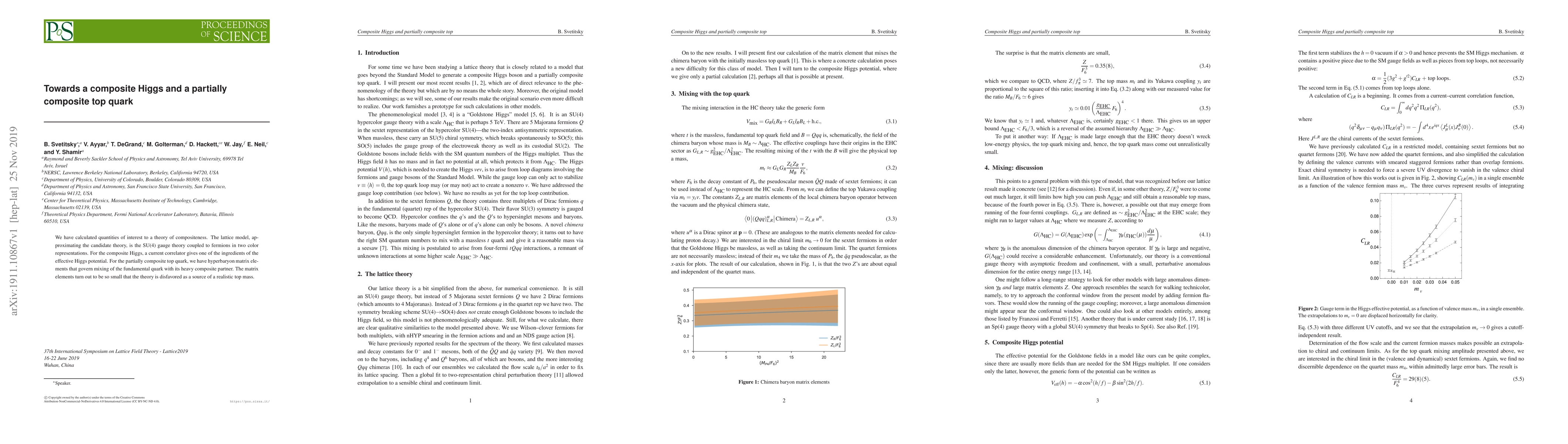 We have calculated quantities of interest to a theory of compositeness. The lattice model, approximating the candidate theory, is the SU(4) gauge theory coupled to fermions in two color representations. For the composite Higgs, a current correlator gives one of the ingredients of the effective Higgs potential. For the partially composite top quark, we have hyperbaryon matrix elements that govern mixing of the fundamental quark with its heavy composite partner. The matrix elements turn out to be so small that the theory is disfavored as a source of a realistic top mass.