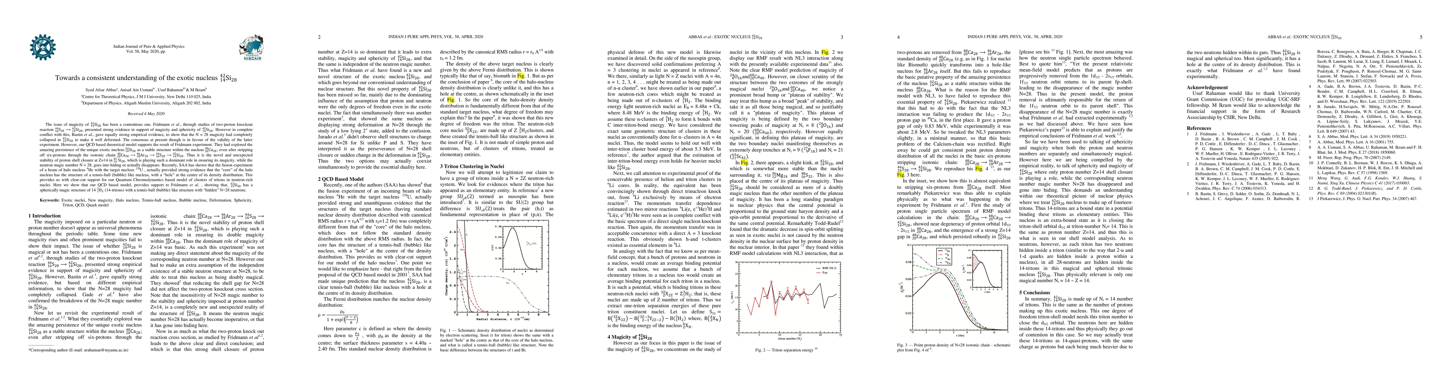 The issue of whether $^{42}_{14}Si_{28}$ is doubly magical or not has been a contentious one. Fridmann {\it et al.} (Nature 435 (2005) 922) through studies of two-proton knockout reaction $^{44}_{16}S_{28} \rightarrow ^{42}_{14}Si_{28}$, presented a strong empirical evidence in support of magicity and sphericity of $^{42}_{14}Si_{28}$. However in complete conflict with this, Bastin {\it et al.} (Phys. Rev. Lett. 99 (2007) 022503) gave equally strong empirical evidences, to show that the N = 28 magicity had completely collapsed, and that $^{42}_{14}Si_{28}$ was a well deformed nucleus. At present the popular consensus (Gade {\it et al.}, Phys. Rev. Lett. 122 (2019) 222501) strongly supports the latter one and discards the former one. Here, while we accept the latter experiment as being fine and good, through a careful study of an RMF model calculation, we show that actually the experimental results of Fridmann are also independently good and consistent. As per the Fridmann experiment, the sphericity and magicity of $^{42}_{14}Si_{28}$ is manifested only through proton number Z=14 being a strong magic number, while the neutron magic number N=28 disappears (or goes into hiding); and still this nucleus is spherical. This is a new and amazing property manifesting itself in this exotic nucleus $^{42}_{14}Si_{28}$. In this paper we provide a consistent understanding of this novel reality within a QCD based model. This model, which has been successful in explanation of the halo phenomenon in exotic nuclei, comes forward to provide the physical reason as to why the Fridmann experiment is correct. This QCD based model shows that it is tritons, as elementary entity making up $^{42}_{14}Si_{28}$, which then provides consistency to the above amazing conclusions arising from the Fridmann experiment.