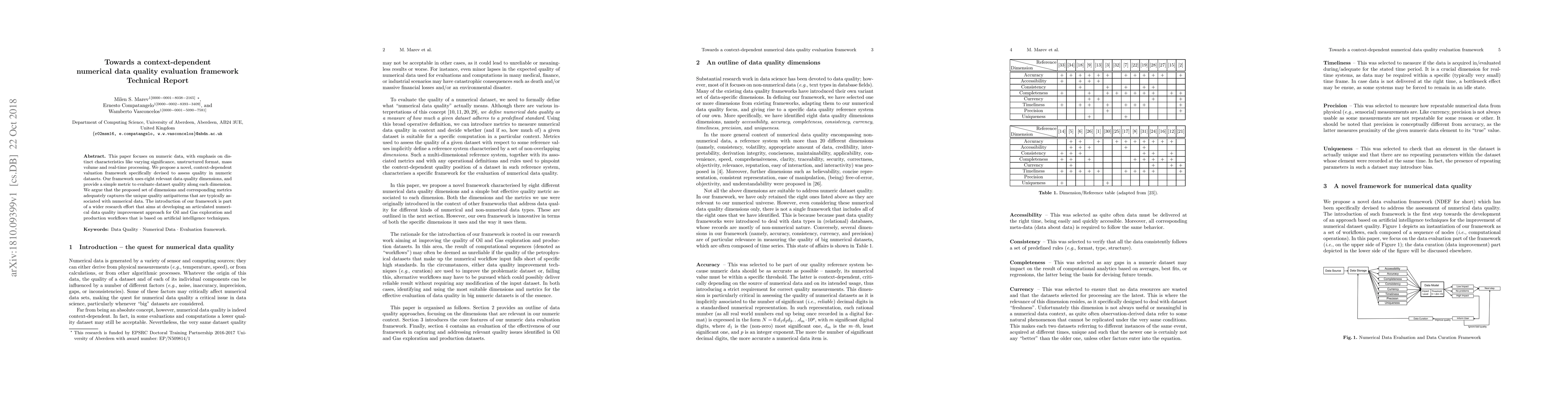 This paper focuses on numeric data, with emphasis on distinct characteristics like varying significance, unstructured format, mass volume and real-time processing. We propose a novel, context-dependent valuation framework specifically devised to assess quality in numeric datasets. Our framework uses eight relevant data quality dimensions, and provide a simple metric to evaluate dataset quality along each dimension. We argue that the proposed set of dimensions and corresponding metrics adequately captures the unique quality antipatterns that are typically associated with numerical data. The introduction of our framework is part of a wider research effort that aims at developing an articulated numerical data quality improvement approach for Oil and Gas exploration and production workflows that is based on artificial intelligence techniques.