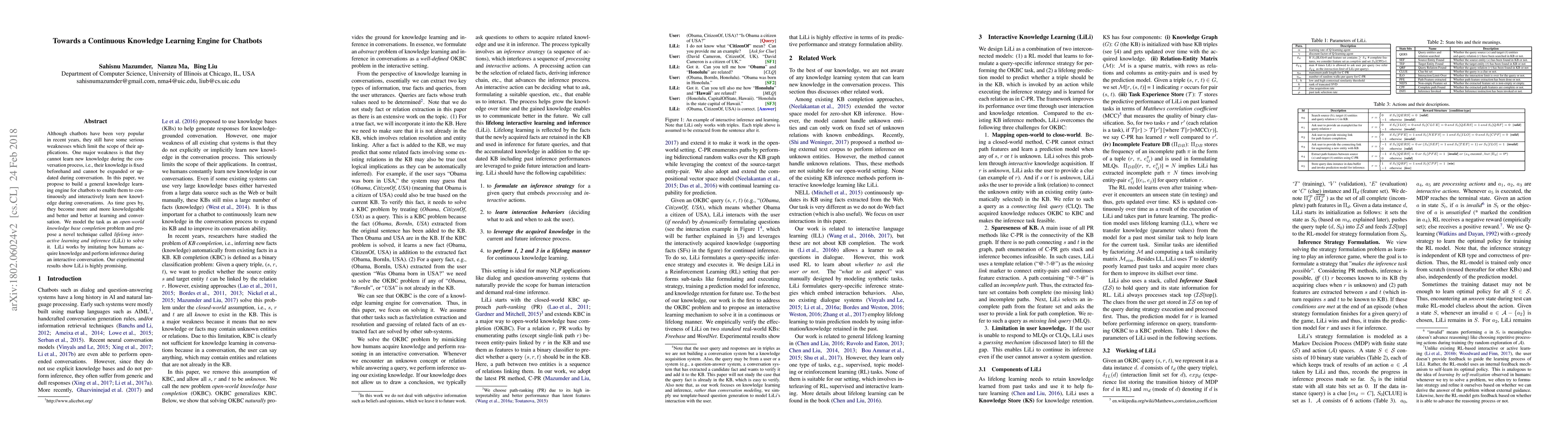 This paper proposes a Continuous Knowledge Learning Engine for chatbots, enabling them to learn new knowledge during conversations through a technique called lifelong interactive learning and inference (LiLi). LiLi mimics human knowledge acquisition and inference in conversations, making chatbots more knowledgeable and efficient over time. Experimental results validate the promising potential of this approach.
