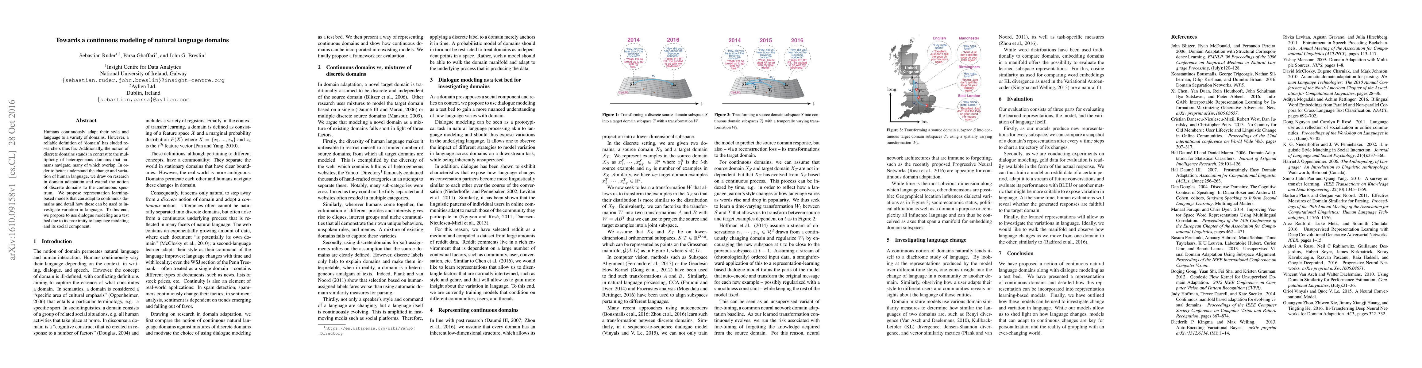 Humans continuously adapt their style and language to a variety of domains. However, a reliable definition of `domain' has eluded researchers thus far. Additionally, the notion of discrete domains stands in contrast to the multiplicity of heterogeneous domains that humans navigate, many of which overlap. In order to better understand the change and variation of human language, we draw on research in domain adaptation and extend the notion of discrete domains to the continuous spectrum. We propose representation learning-based models that can adapt to continuous domains and detail how these can be used to investigate variation in language. To this end, we propose to use dialogue modeling as a test bed due to its proximity to language modeling and its social component.