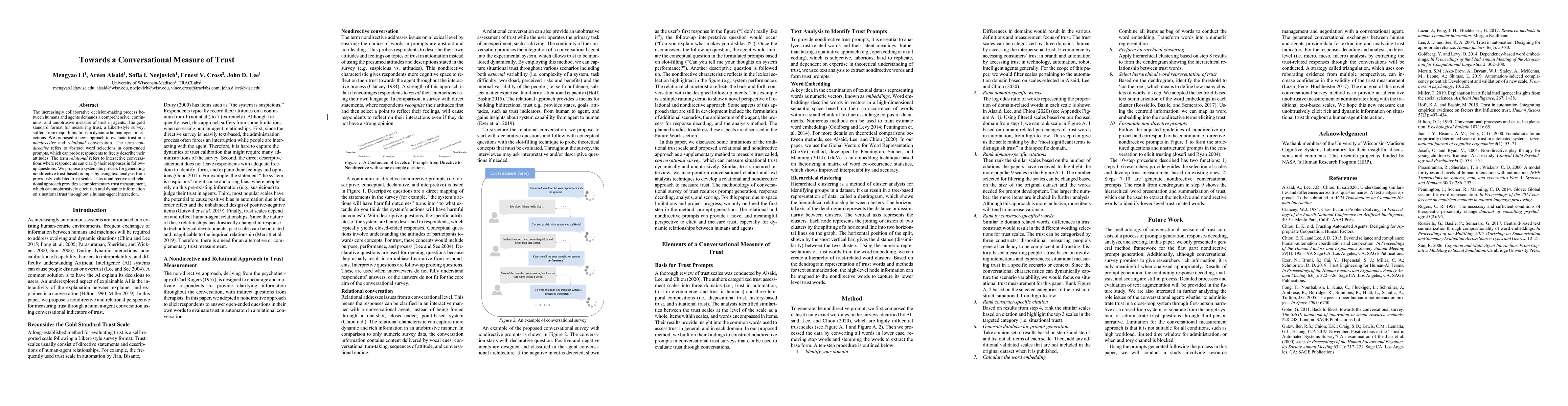 The increasingly collaborative decision-making process between humans and agents demands a comprehensive, continuous, and unobtrusive measure of trust in agents. The gold standard format for measuring trust, a Likert-style survey, suffers from major limitations in dynamic human-agent interactions. We proposed a new approach to evaluate trust in a nondirective and relational conversation. The term nondirective refers to abstract word selections in open-ended prompts, which can probe respondents to freely describe their attitudes. The term relational refers to interactive conversations where respondents can clarify their responses in followup questions. We propose a systematic process for generating nondirective trust-based prompts by using text analysis from previously validated trust scales. This nondirective and relational approach provides a complementary trust measurement, which can unobtrusively elicit rich and dynamic information on situational trust throughout a human-agent interaction.