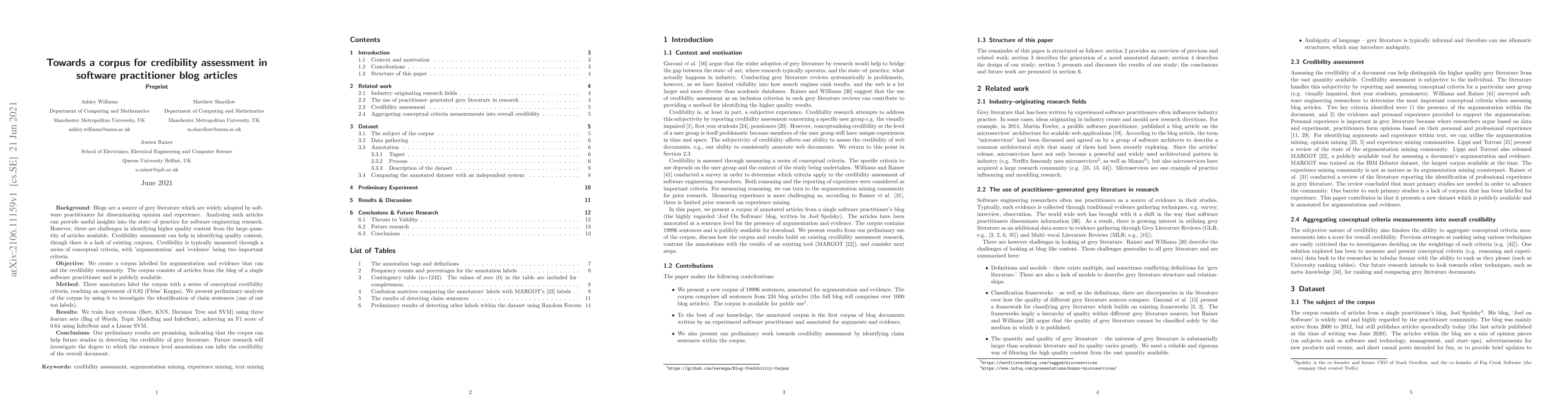 This paper develops a corpus for assessing credibility in software practitioner blog articles, focusing on argumentation and evidence. The corpus, labeled by three annotators, is used to train machine learning models to identify claim sentences, achieving promising F1 scores, suggesting potential for future credibility detection studies.