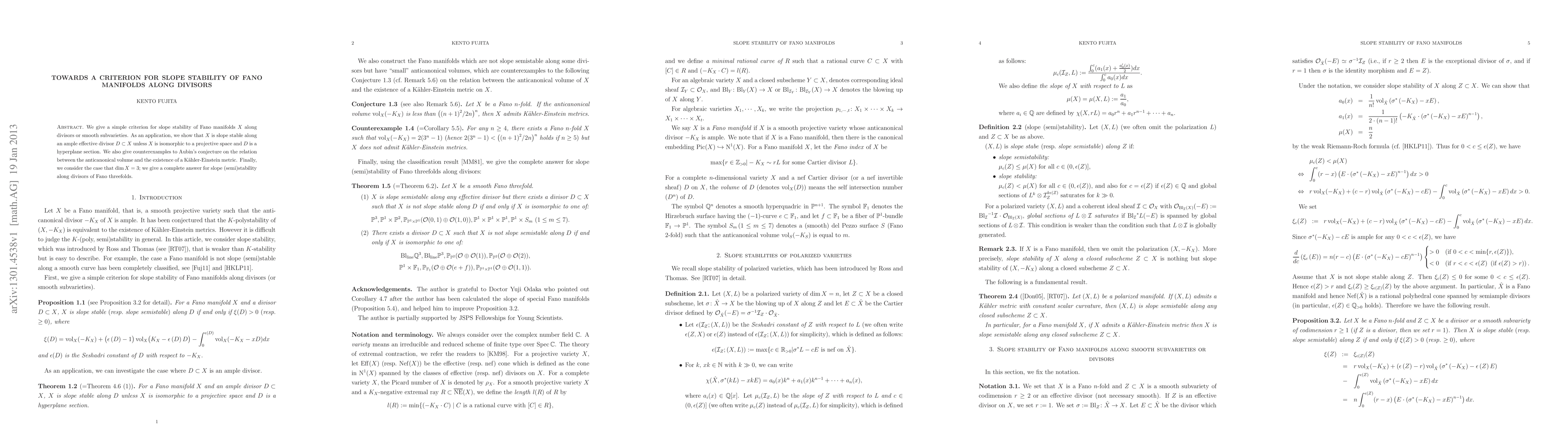 This paper provides a criterion for slope stability of Fano manifolds along divisors, demonstrating that such manifolds are slope stable unless they are projective spaces with hyperplane sections. It also refutes Aubin's conjecture on the connection between anticanonical volume and Kähler-Einstein metrics, and offers a complete analysis of slope stability in Fano threefolds.