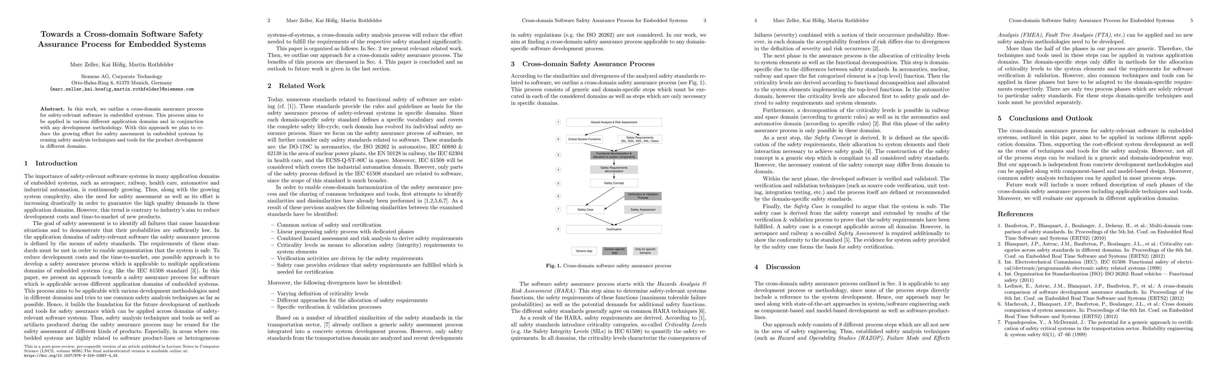 In this work, we outline a cross-domain assurance process for safety-relevant software in embedded systems. This process aims to be applied in various different application domains and in conjunction with any development methodology. With this approach we plan to reduce the growing effort for safety assessment in embedded systems by reusing safety analysis techniques and tools for the product development in different domains.