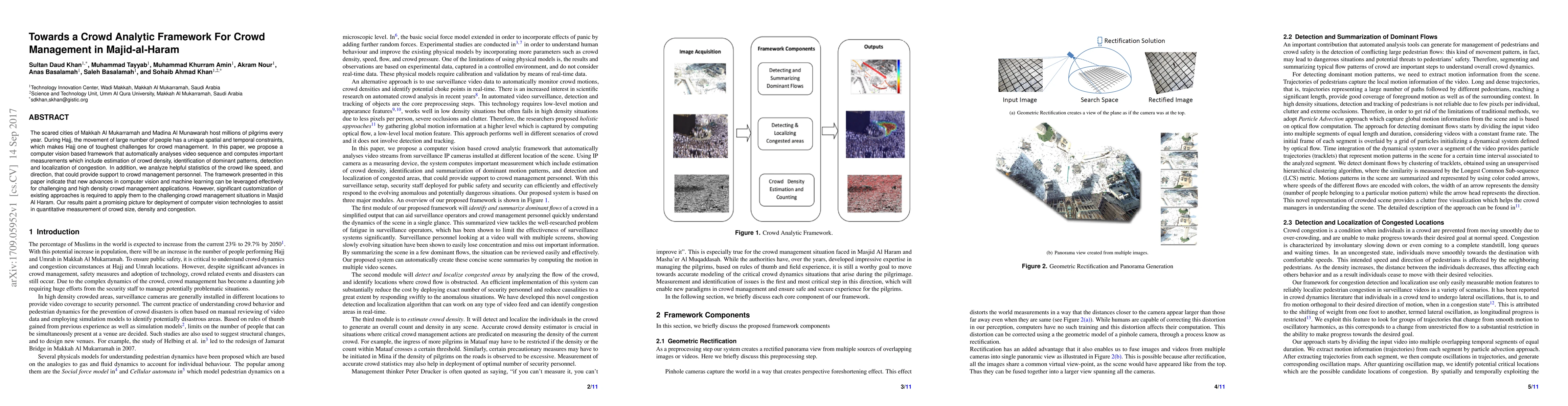 The scared cities of Makkah Al Mukarramah and Madina Al Munawarah host millions of pilgrims every year. During Hajj, the movement of large number of people has a unique spatial and temporal constraints, which makes Hajj one of toughest challenges for crowd management. In this paper, we propose a computer vision based framework that automatically analyses video sequence and computes important measurements which include estimation of crowd density, identification of dominant patterns, detection and localization of congestion. In addition, we analyze helpful statistics of the crowd like speed, and direction, that could provide support to crowd management personnel. The framework presented in this paper indicate that new advances in computer vision and machine learning can be leveraged effectively for challenging and high density crowd management applications. However, significant customization of existing approaches is required to apply them to the challenging crowd management situations in Masjid Al Haram. Our results paint a promising picture for deployment of computer vision technologies to assist in quantitative measurement of crowd size, density and congestion.