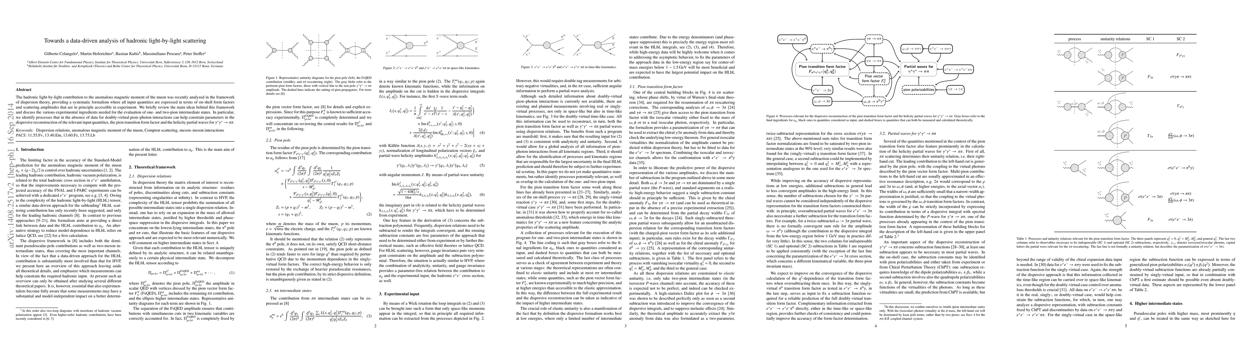 The hadronic light-by-light contribution to the anomalous magnetic moment of the muon was recently analyzed in the framework of dispersion theory, providing a systematic formalism where all input quantities are expressed in terms of on-shell form factors and scattering amplitudes that are in principle accessible in experiment. We briefly review the main ideas behind this framework and discuss the various experimental ingredients needed for the evaluation of one- and two-pion intermediate states. In particular, we identify processes that in the absence of data for doubly-virtual pion-photon interactions can help constrain parameters in the dispersive reconstruction of the relevant input quantities, the pion transition form factor and the helicity partial waves for $\gamma^*\gamma^*\to\pi\pi$.