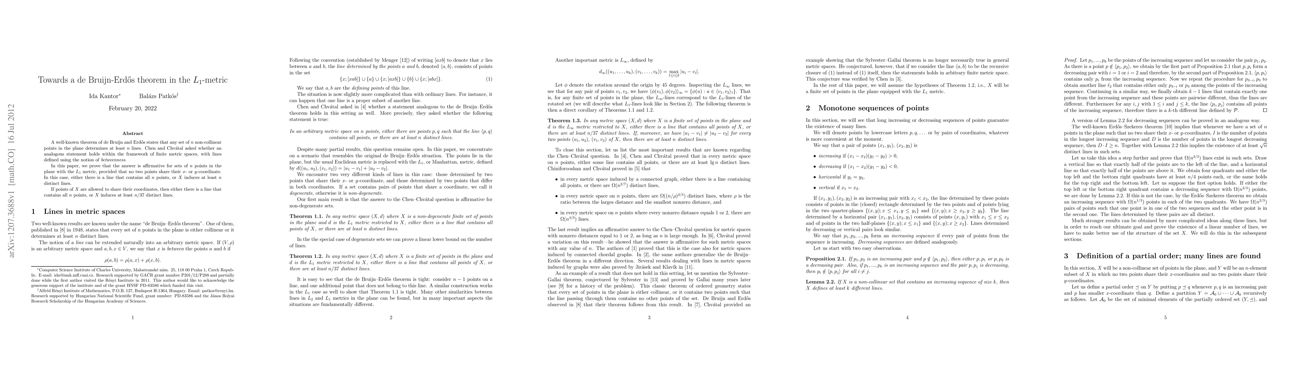 A well-known theorem of de Bruijn and Erd\H{o}s states that any set of $n$ non-collinear points in the plane determines at least $n$ lines. Chen and Chv\'{a}tal asked whether an analogous statement holds within the framework of finite metric spaces, with lines defined using the notion of {\em betweenness}. In this paper, we prove that the answer is affirmative for sets of $n$ points in the plane with the $L_1$ metric, provided that no two points share their $x$- or $y$-coordinate. In this case, either there is a line that contains all $n$ points, or $X$ induces at least $n$ distinct lines. If points of $X$ are allowed to share their coordinates, then either there is a line that contains all $n$ points, or $X$ induces at least $n/37$ distinct lines.
