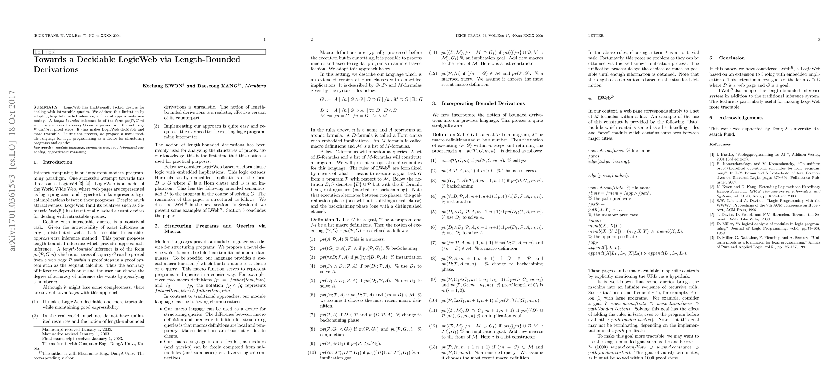 This paper introduces length-bounded inference to make LogicWeb decidable and more tractable, addressing its traditional inability to handle intractable queries. It proposes a novel module language for logic programming to structure programs and queries within a specified number of proof steps.