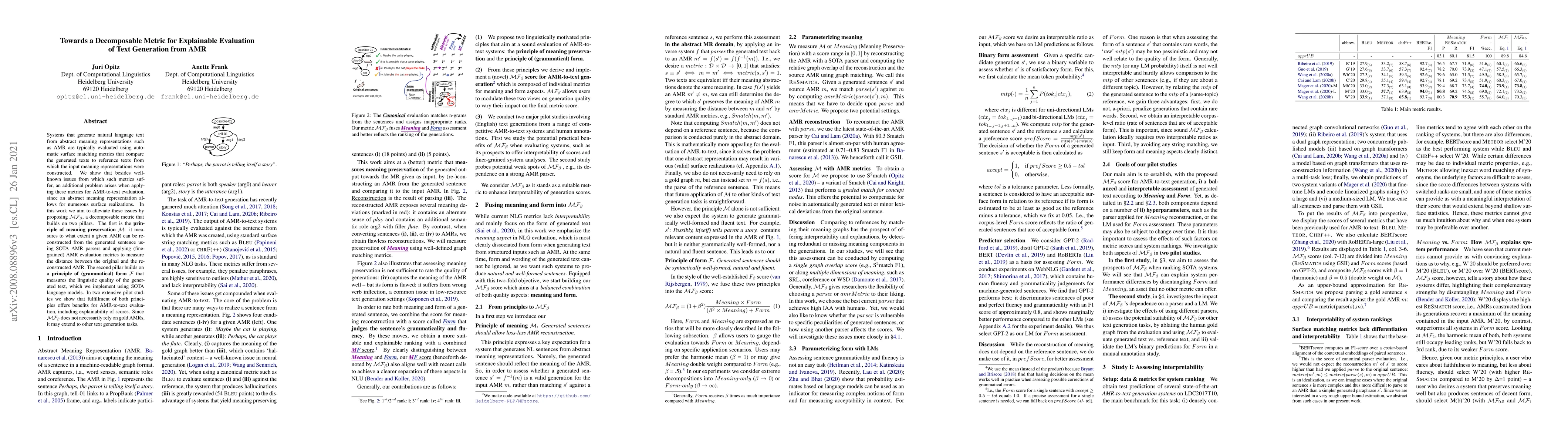 The paper proposes $\mathcal{M}\mathcal{F}_\beta$, a decomposable metric for evaluating text generated from abstract meaning representations (AMR), which assesses both meaning preservation and linguistic form quality. This approach aims to address the shortcomings of existing automatic metrics, offering more explainable evaluation results.