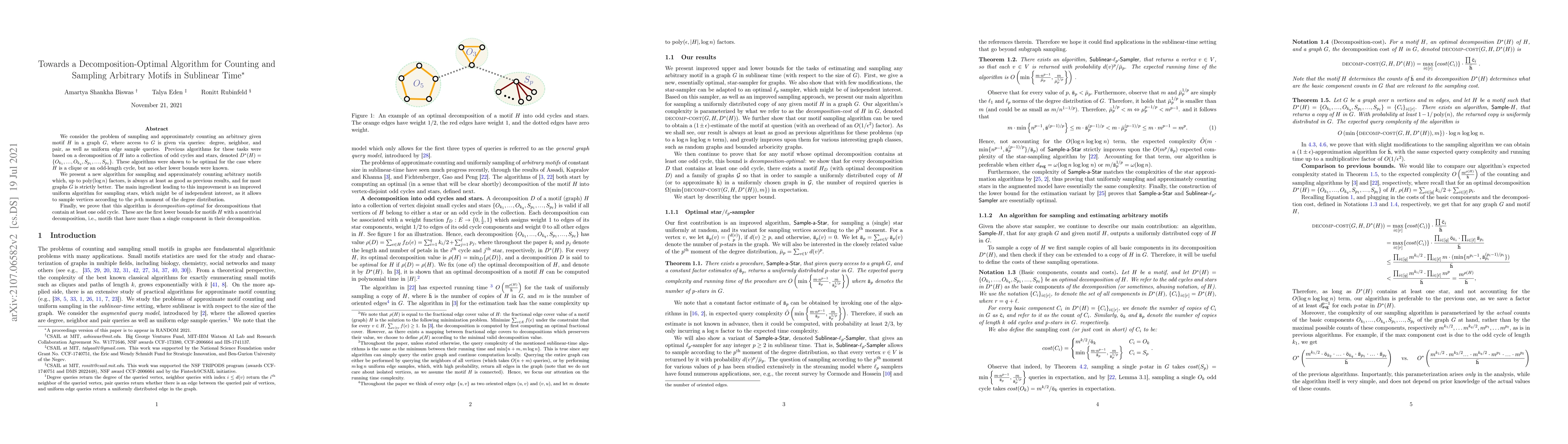 This paper presents a new algorithm for sampling and counting arbitrary motifs in graphs, improving upon previous methods based on decomposition into odd cycles and stars. The algorithm is shown to be decomposition-optimal for motifs containing at least one odd cycle, providing the first lower bounds for such nontrivial decompositions.