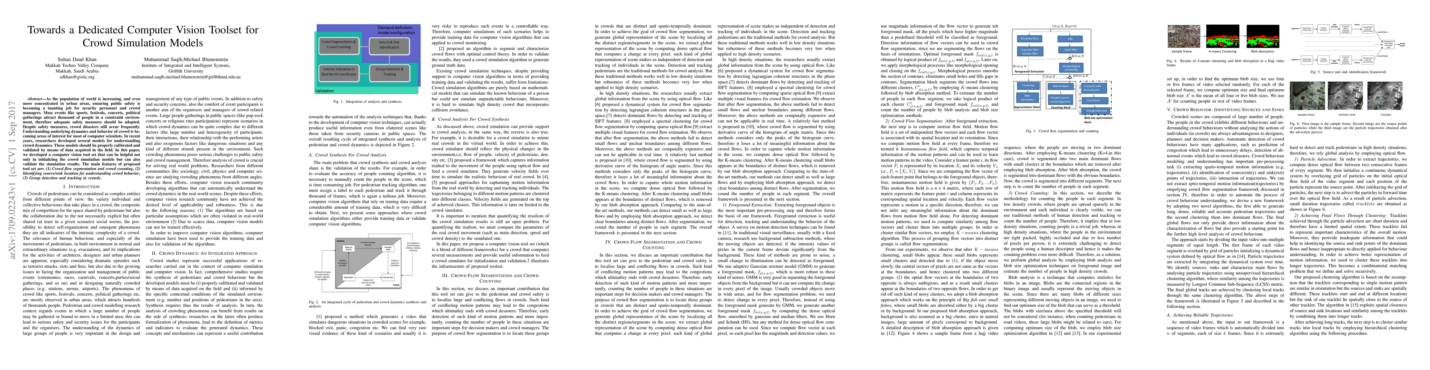 The tool set provides features such as crowd flow segmentation, source/sink location identification, and group detection/tracking to help validate simulation results.