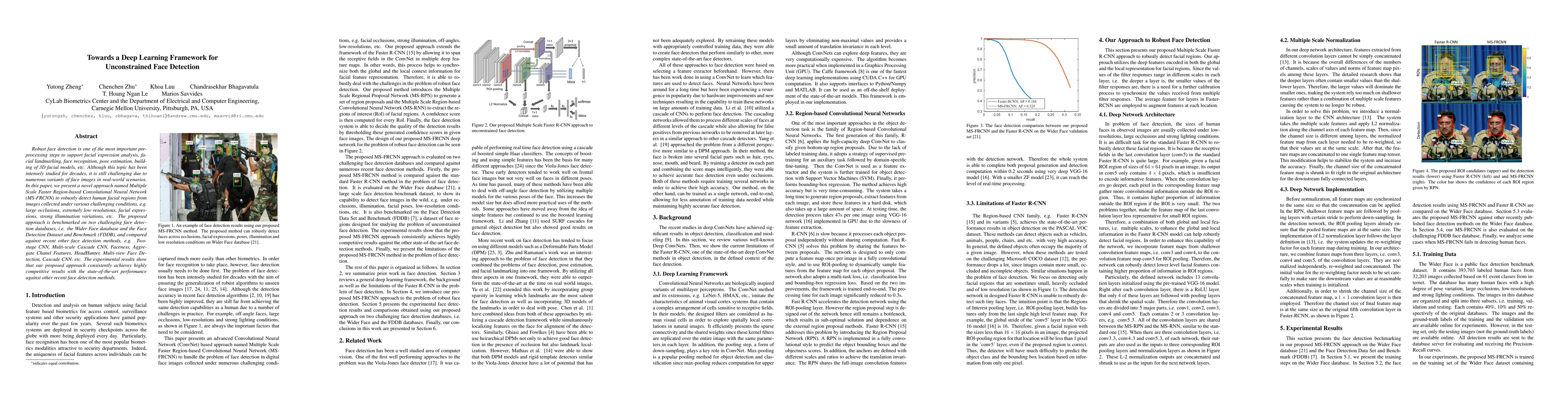 Robust face detection is one of the most important pre-processing steps to support facial expression analysis, facial landmarking, face recognition, pose estimation, building of 3D facial models, etc. Although this topic has been intensely studied for decades, it is still challenging due to numerous variants of face images in real-world scenarios. In this paper, we present a novel approach named Multiple Scale Faster Region-based Convolutional Neural Network (MS-FRCNN) to robustly detect human facial regions from images collected under various challenging conditions, e.g. large occlusions, extremely low resolutions, facial expressions, strong illumination variations, etc. The proposed approach is benchmarked on two challenging face detection databases, i.e. the Wider Face database and the Face Detection Dataset and Benchmark (FDDB), and compared against recent other face detection methods, e.g. Two-stage CNN, Multi-scale Cascade CNN, Faceness, Aggregate Chanel Features, HeadHunter, Multi-view Face Detection, Cascade CNN, etc. The experimental results show that our proposed approach consistently achieves highly competitive results with the state-of-the-art performance against other recent face detection methods.