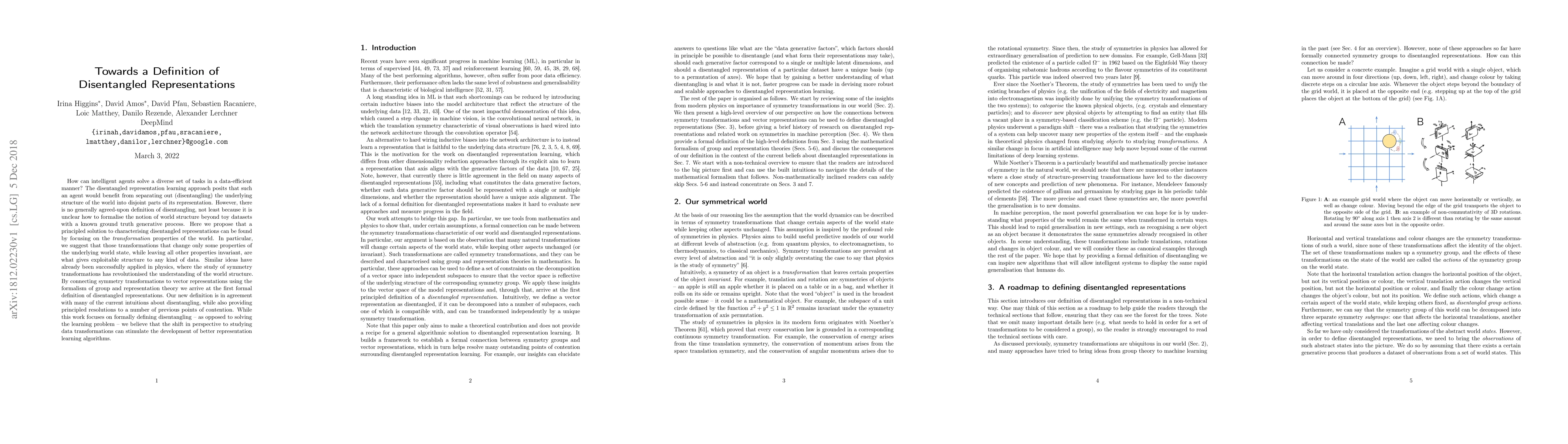 How can intelligent agents solve a diverse set of tasks in a data-efficient manner? The disentangled representation learning approach posits that such an agent would benefit from separating out (disentangling) the underlying structure of the world into disjoint parts of its representation. However, there is no generally agreed-upon definition of disentangling, not least because it is unclear how to formalise the notion of world structure beyond toy datasets with a known ground truth generative process. Here we propose that a principled solution to characterising disentangled representations can be found by focusing on the transformation properties of the world. In particular, we suggest that those transformations that change only some properties of the underlying world state, while leaving all other properties invariant, are what gives exploitable structure to any kind of data. Similar ideas have already been successfully applied in physics, where the study of symmetry transformations has revolutionised the understanding of the world structure. By connecting symmetry transformations to vector representations using the formalism of group and representation theory we arrive at the first formal definition of disentangled representations. Our new definition is in agreement with many of the current intuitions about disentangling, while also providing principled resolutions to a number of previous points of contention. While this work focuses on formally defining disentangling - as opposed to solving the learning problem - we believe that the shift in perspective to studying data transformations can stimulate the development of better representation learning algorithms.