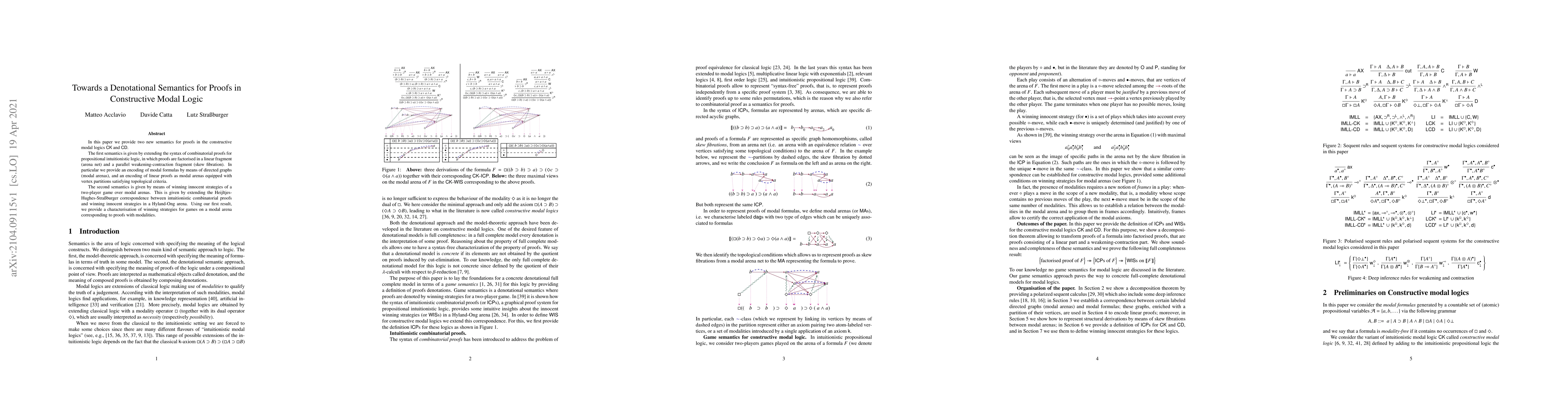 In this paper we provide two new semantics for proofs in the constructive modal logics CK and CD. The first semantics is given by extending the syntax of combinatorial proofs for propositional intuitionistic logic, in which proofs are factorised in a linear fragment (arena net) and a parallel weakening-contraction fragment (skew fibration). In particular we provide an encoding of modal formulas by means of directed graphs (modal arenas), and an encoding of linear proofs as modal arenas equipped with vertex partitions satisfying topological criteria. The second semantics is given by means of winning innocent strategies of a two-player game over modal arenas. This is given by extending the Heijltjes-Hughes-Stra{\ss}burger correspondence between intuitionistic combinatorial proofs and winning innocent strategies in a Hyland-Ong arena. Using our first result, we provide a characterisation of winning strategies for games on a modal arena corresponding to proofs with modalities.