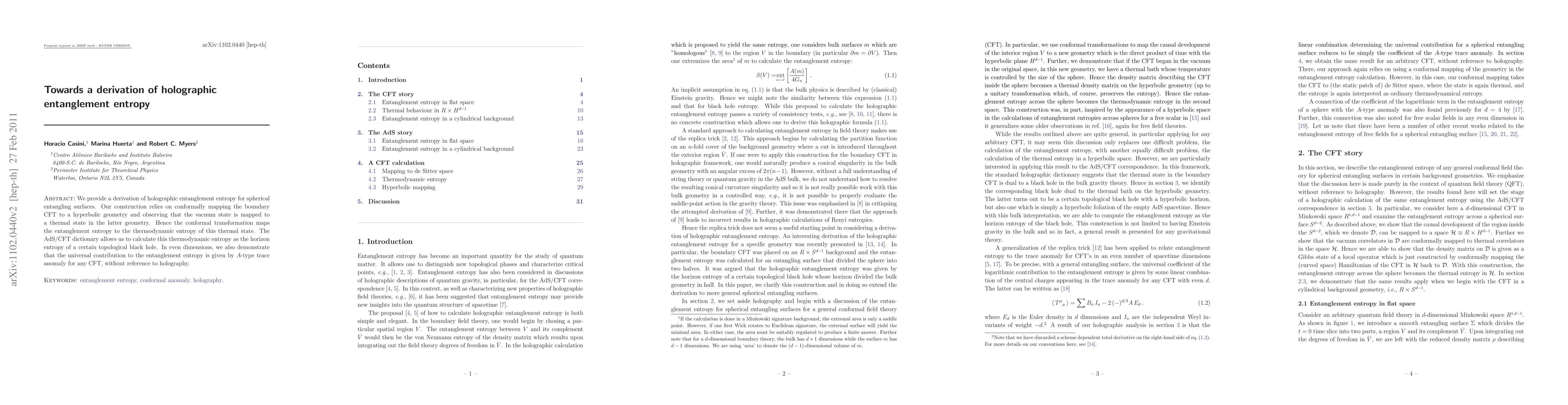 Summary: This paper derives holographic entanglement entropy for spherical entangling surfaces by conformally mapping the boundary CFT to hyperbolic geometry, showing the mapping of vacuum state to thermal state, and calculating the thermodynamic entropy as the horizon entropy of a topological black hole. It also proves the universal contribution to entanglement entropy in even dimensions corresponds to the A-type trace anomaly.