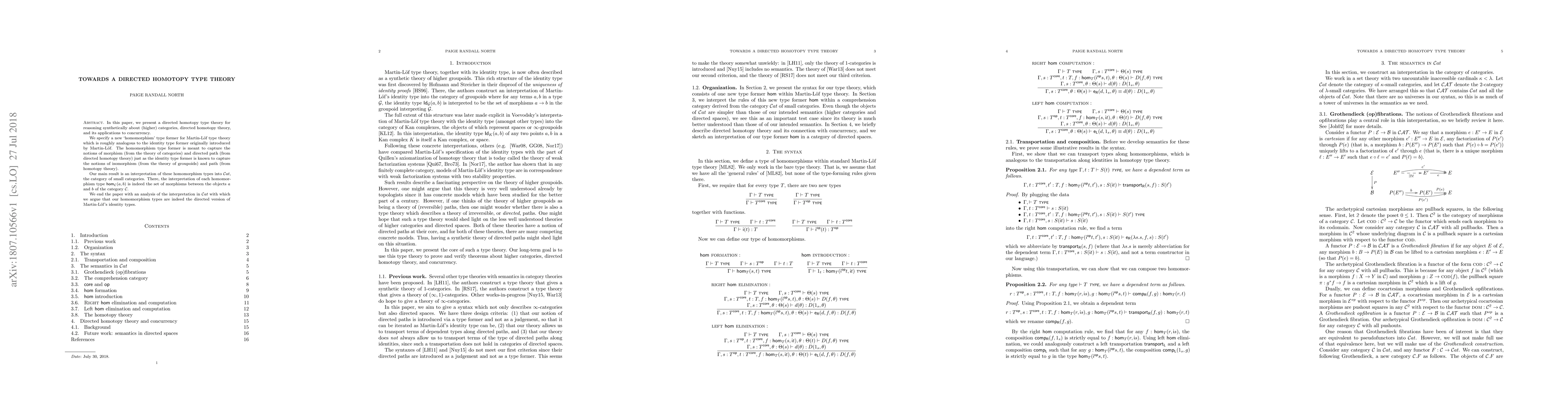 This paper introduces a directed homotopy type theory that synthetically reasons about higher categories and directed homotopy theory, proposing a new "homomorphism" type former in Martin-Löf type theory. The main result is an interpretation of these homomorphism types into the category of small categories, establishing them as the directed analog of Martin-Löf's identity types.
