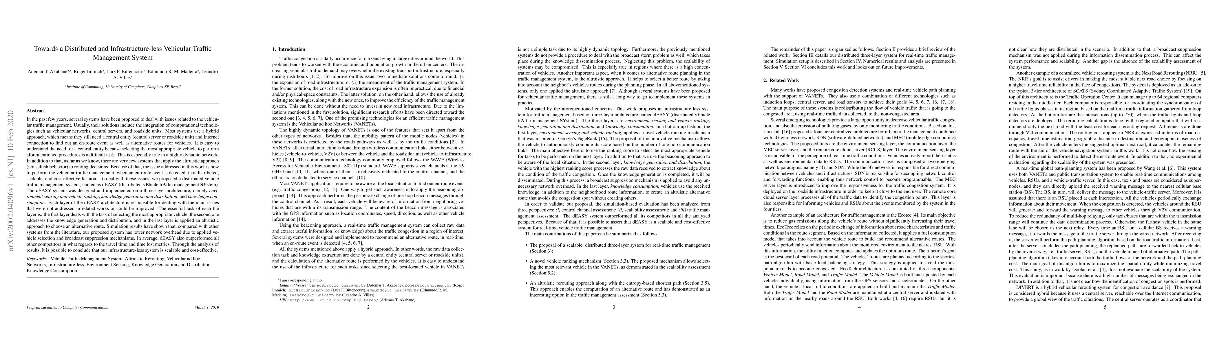 In the past few years, several systems have been proposed to deal with issues related to the vehicular traffic management. Usually, their solutions include the integration of computational technologies such as vehicular networks, central servers, and roadside units. Most systems use a hybrid approach, which means they still need a central entity (central server or roadside unit) and Internet connection to find out an en-route event as well as alternative routes for vehicles. It is easy to understand the need for a central entity because selecting the most appropriate vehicle to perform aforementioned procedures is a difficult task. In addition to that, as far as we know, there are very few systems that apply the altruistic approach (not selfish behavior) to routing decisions. Because of that, the issue addressed in this work is how to perform the vehicular traffic management, when an en-route event is detected, in a distributed, scalable, and cost-effective fashion. To deal with these issues, we proposed a distributed vehicle traffic management system, named as dEASY (distributed vEhicle trAffic management SYstem). The dEASY system was designed and implemented on a three-layer architecture, namely environment sensing and vehicle ranking, knowledge generation and distribution, and knowledge consumption. Each layer of the dEASY architecture is responsible for dealing with the main issues that were not addressed in related works or could be improved. Simulation results have shown that, compared with other systems from the literature, our proposed system has lower network overhead due to applied vehicle selection and broadcast suppression mechanisms. In average, dEASY also outperformed all other competitors in what regards to the travel time and time lost metrics. Through the analysis of results, it is possible to conclude that our infrastructure-less system is scalable and cost-effective.