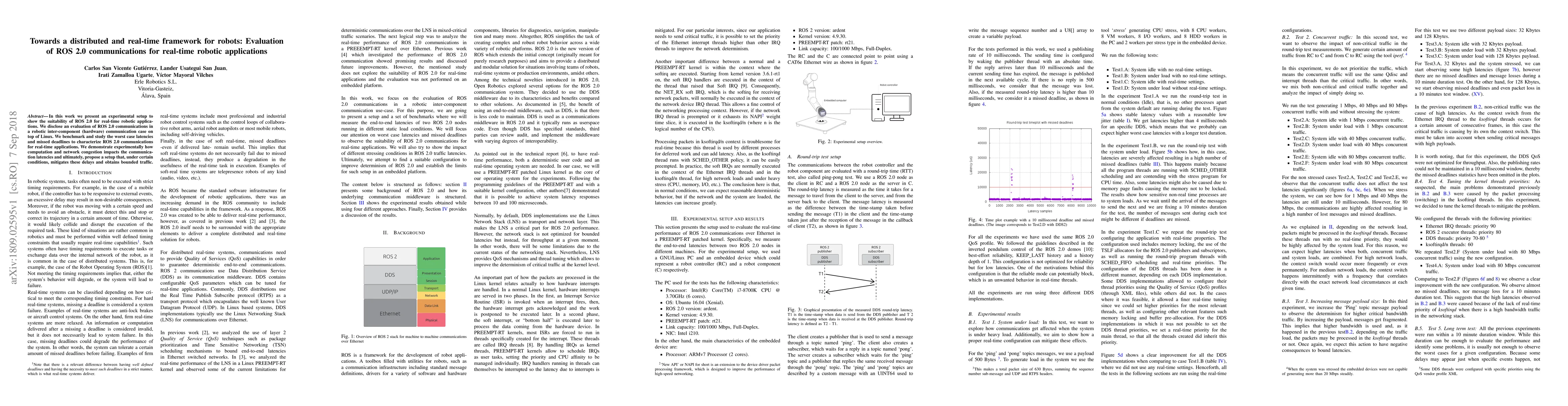 In this work we present an experimental setup to show the suitability of ROS 2.0 for real-time robotic applications. We disclose an evaluation of ROS 2.0 communications in a robotic inter-component (hardware) communication case on top of Linux. We benchmark and study the worst case latencies and missed deadlines to characterize ROS 2.0 communications for real-time applications. We demonstrate experimentally how computation and network congestion impacts the communication latencies and ultimately, propose a setup that, under certain conditions, mitigates these delays and obtains bounded traffic.