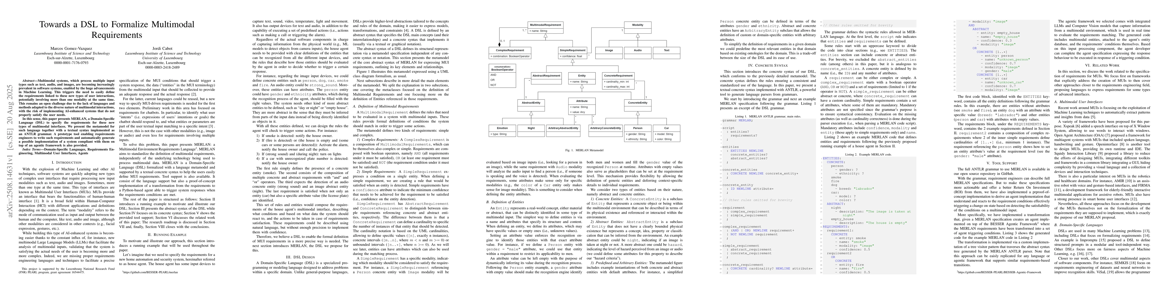 MERLAN introduces a metamodel and DSL for formalizing multimodal user interface requirements, along with a prototype tool for generating agent implementations from these specifications.