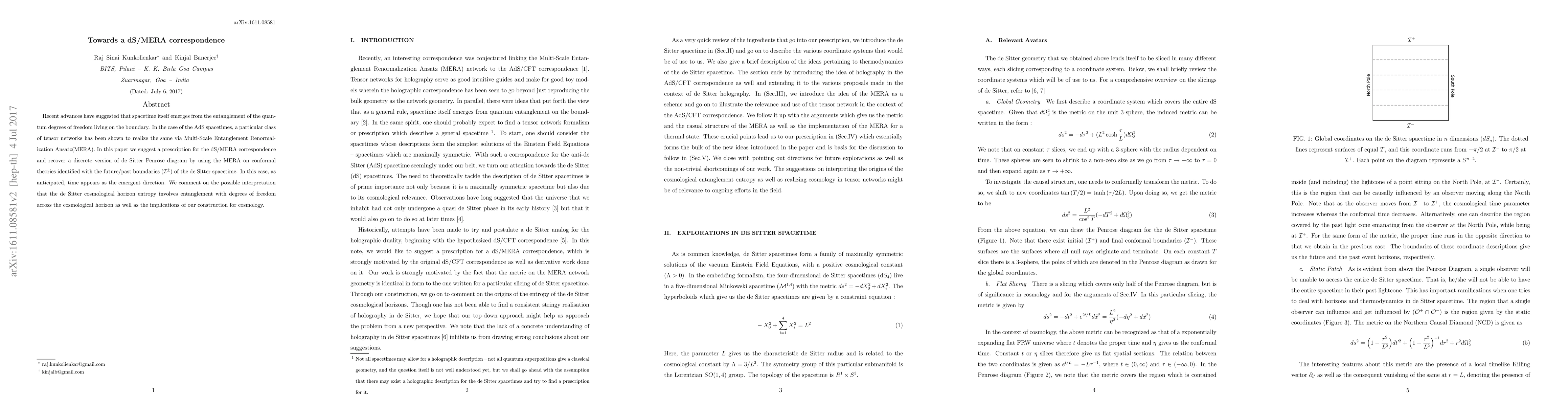 This paper proposes a dS/MERA correspondence, suggesting that de Sitter spacetime can be represented using the Multi-Scale Entanglement Renormalization Ansatz (MERA) on conformal theories. It recovers a discrete de Sitter Penrose diagram and discusses the emergent nature of time and the cosmological horizon entropy's entanglement implications.
