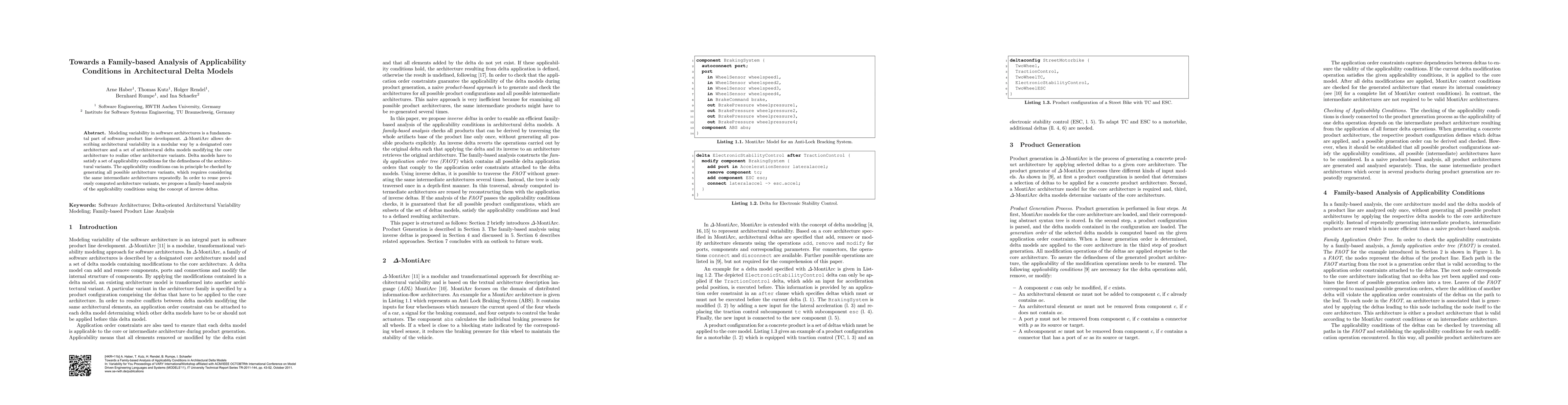 Modeling variability in software architectures is a fundamental part of software product line development. ?-MontiArc allows describing architectural variability in a modular way by a designated core architecture and a set of architectural delta models modifying the core architecture to realize other architecture variants. Delta models have to satisfy a set of applicability conditions for the definedness of the architectural variants. The applicability conditions can in principle be checked by generating all possible architecture variants, which requires considering the same intermediate architectures repeatedly. In order to reuse previously computed architecture variants, we propose a family-based analysis of the applicability conditions using the concept of inverse deltas.
